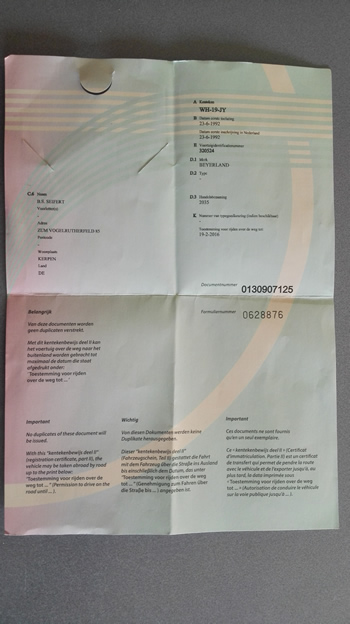 1. Den Kentekenbewijs. Das ist im Prinzip unsere Zulassungsbescheinigung Teil 2. Was früher der Fahrzeugschein war. In Holland ist das, anders als bei uns, eine Plastikkarte.