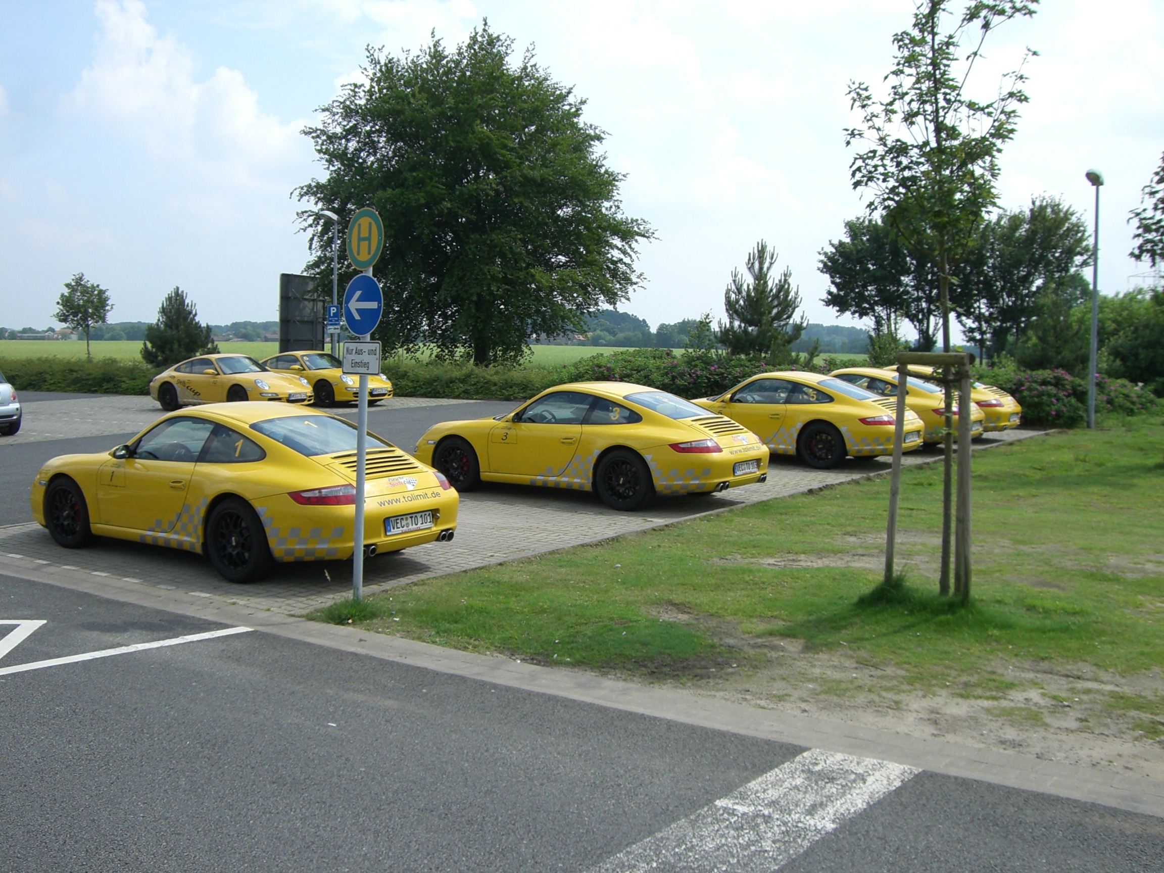 Passend zu diesem Gefühl nehmen wir wohlwollend in der Nachbarreihe gleich 6 gelbe Porsche 911 zur Kenntnis. Wir fühlen uns spontan in die USA und an den Checkpoint eines kleinen Cannonball- Rennens erinnert.