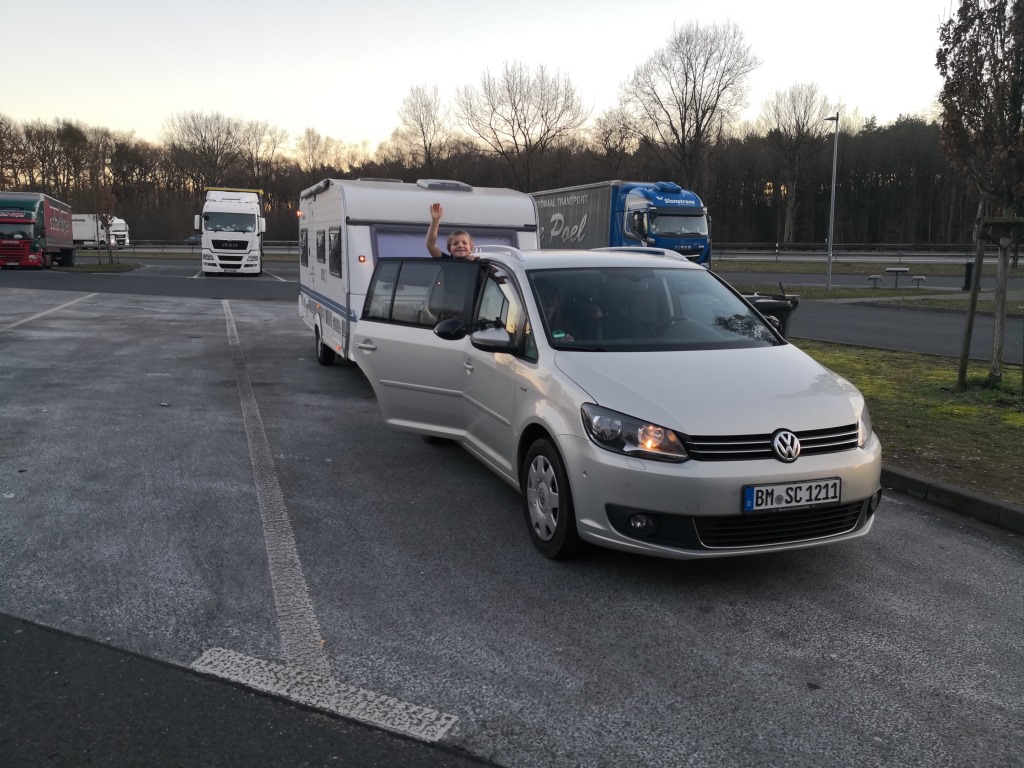 Ich selbst hingegen kann leider wenig helfen und muss im fernen Köln arbeiten. Nützt ja nichts. Irgendwo muss das Budget für unsere Reisen ja herkommen. Gegen Mittag ist aber auch die Arbeit geschafft. Und als ich mich durch die hart umkämpften Plätze im Berufsverkehr geschlagen habe und zuhause ankomme, sind auch die Kinder aus Schule und Kindergarten schon zurück und Anja ist sogar mit dem Laden des Wohnwagens fertig. Da kann es eigentlich schon losgehen!