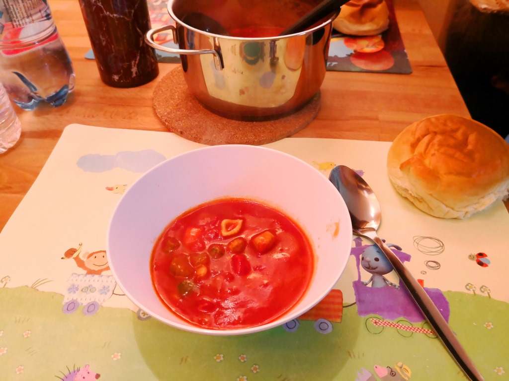 Sehr spät, nämlich erst um kurz nach 20 Uhr, sind wir vom Einkaufen zurück. Inzwischen haben wir richtig Hunger! Und da es nicht nur dunkel, sondern auch inzwischen auch richtig frisch geworden ist, brauchen wir für das heimelige Campinggefühl jetzt einfach was warmes im Bauch! Das brotige Abendbrot wird kurzerhand für den morgigen Frühstückstisch umdisponiert, stattdessen gibt es im Wohnwagen eine Unox- Fertigsuppe aus der Tüte. Blöd nur, dass ausgerechnet der einzige große Topf noch im Eifelland liegt! Ihr wisst schon, wir betreiben ja zwei Wohnwagen und müssen uns hierfür erst noch vernünftig organisieren…
