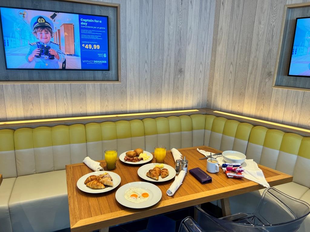 Für das Mittagessen schauen wir einmal mehr im Squok Club vorbei. Das Mittagessen ist hier wirklich sehr kindgerecht aufbereitet mit Pommes, Nudeln, Würstchen, Burgerpatties, Kartoffelpüree und vielen Dingen mehr, die Kinder gerne essen. Dazu liegen auch noch die Reste des Frühstücks als Alternative bereit. Wir probieren uns einmal durch das angebotene Menü und fühlen uns fast ein wenig wie bei IKEA an einem Samstag. 😉 Schmeckt aber nicht schlecht! Blöd ist nur, dass die Crew hier auf Augenhöhe mehr wie einmal die Erwachsenen bedient, anstelle nach unten zu schauen, wo die zahlreichen Kids kaum über die Fensterscheibe blicken können aber mitansehen müssen, wie Erwachsene, die nach ihnen kommen, vor ihnen bedient werden.