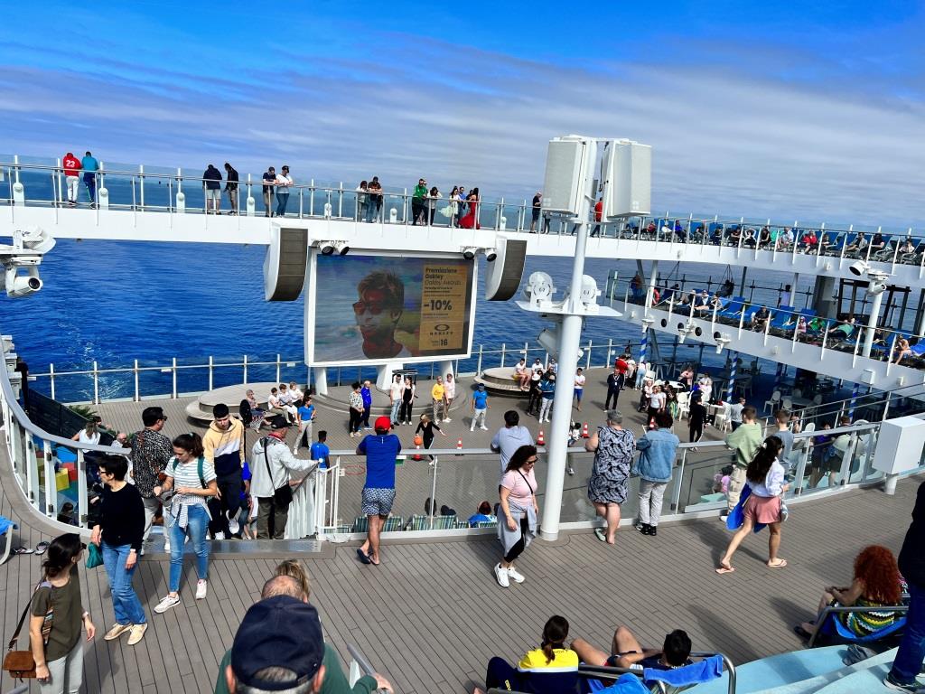 Schon im Gang zu den Aufzügen ist es überraschend voll und spätestens, als wir den offenen Bereich am Heck des Decks 16 erreichen, wird klar, dass heute wirklich kein Landausflug die Leute verschwinden lässt. Hier ist High Life! Musik dröhnt aus den Boxen, einige tanzen, andere sitzen auf der treppenartigen Konstruktion des Piazza del Campo und schauen gelangweilt den Tanzwilligen zu. Nur wenige haben einen Drink in der Hand was daran liegt, dass die Bar hier am Heck geschlossen ist.