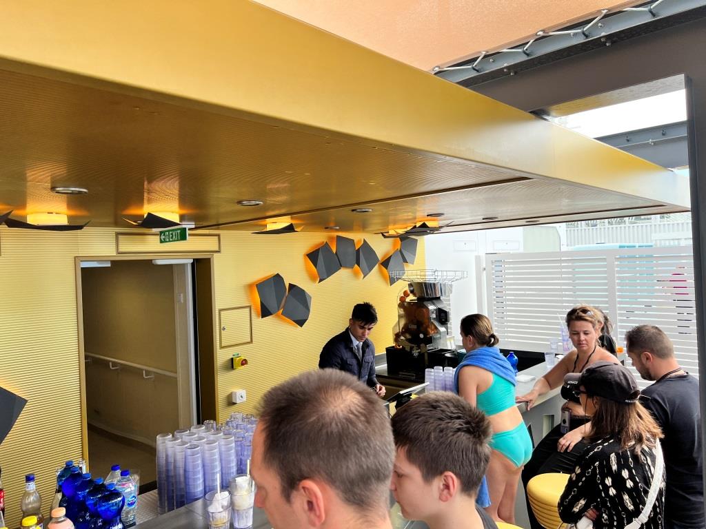 Wer etwas zum Trinken in der Hand hat, kommt aus dem Mittelbereich des Schiffes. Da muss es also eine offene Bar geben. Wir folgen dem Strom an Leuten und entdecken tatsächlich eine geöffnete Bar, wo wir nach längerer (sehr langer!) Wartezeit einen alkoholfreien Pink Panther für Anja und eine Cola Light für mich bestellen. Ist beides in unserem Mydrinks Getränkepaket enthalten.