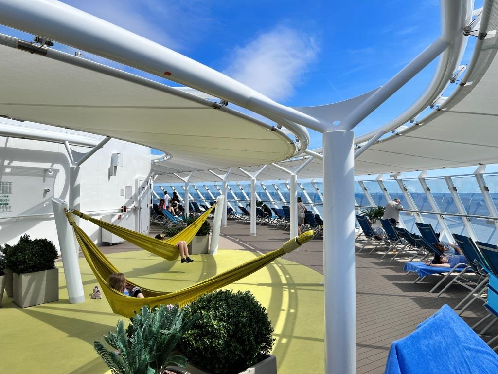 Mit dem Eis in der Hand schlendern wir das Deck 8 und den Infinity Walk weiter entlang, bis wir zum Bug des Schiffes gelangen. Dieses Mal aber nicht oberhalb der Kommandobrücke, sondern unterhalb. Und hier muss ich meine vorhin getroffene Meinung über das Schiff ein wenig revidieren! Hier unten auf Deck 8 ist es nämlich gar nicht so sehr voll. Und mehr noch: Hier gibt es richtig gemütliche Liegen, Lounges und Sitzgelegenheiten zum Chillen und Ausruhen sowohl im Innen- wie im Außenbereich. Nix mit lauter Musik, nix mit Partyvolk. Nix mit Pool an einem Sommertag im August. Ist hier gar nicht vorgesehen und hätte auch keinen Raum dafür. Nur gediegene Atmosphäre, aber ohne Sorge haben zu müssen, dass gleich die Gräfin von Kleinkleckerwitz um die Ecke kommt und unsere eher legere Garderobe bemängelt. Gemütlich einfach! Hier bleiben wir eine Zeit und fühlen uns wohl.