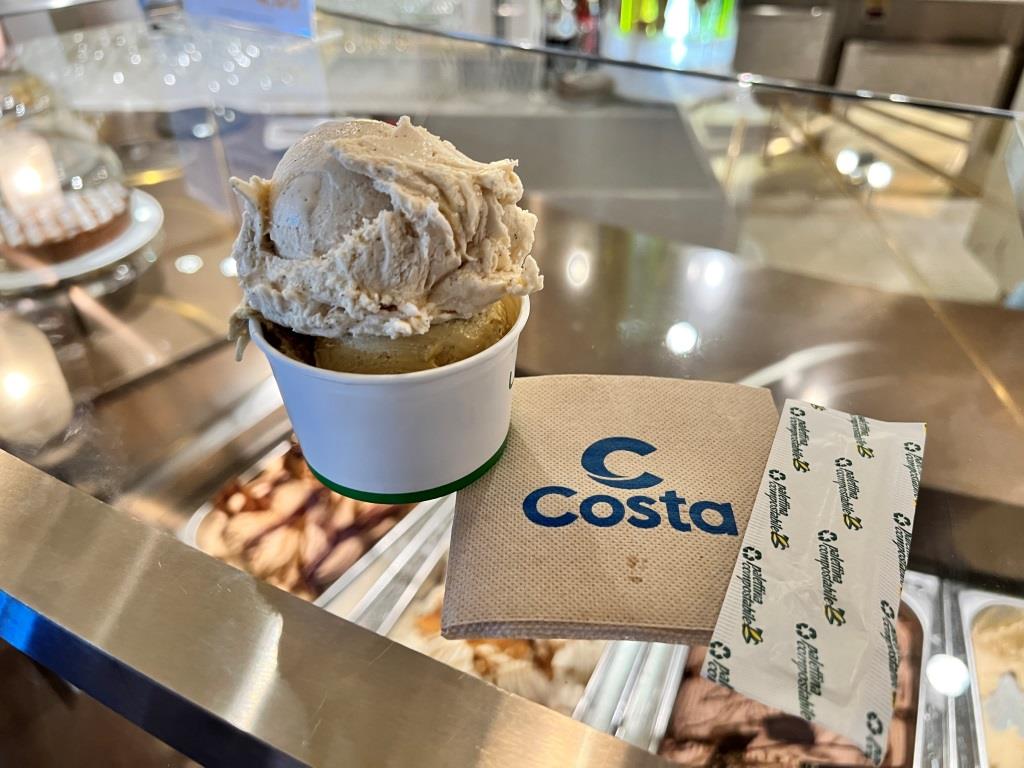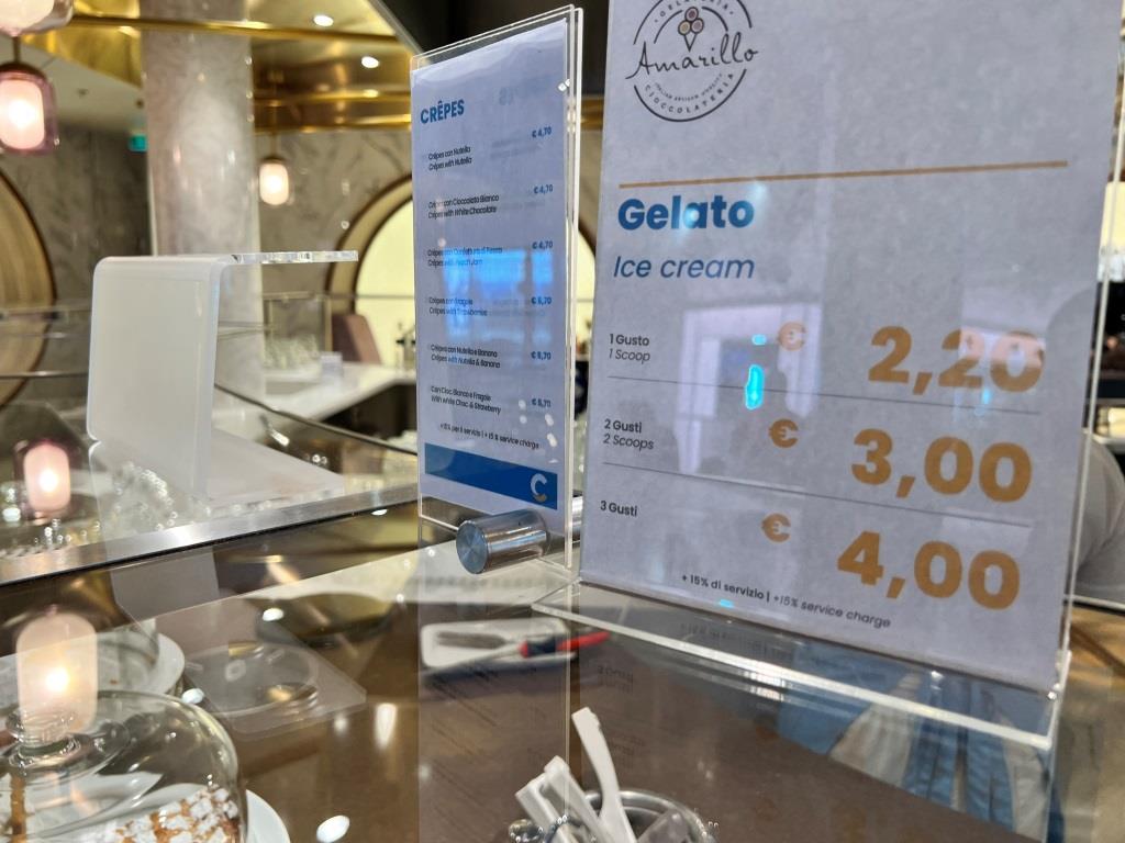 Auf Deck 8 befindet sich darüber hinaus auch die Eisdiele. Auch, wenn Eis nicht in unserem Paket enthalten ist und für eine Kugel Eis mit Seezuschlag hier kühne 2,20 € aufgerufen werden, lassen wir uns das leckere Eis schmecken. In einer touristischen Region hier in Italien hätte man wohl kaum viel weniger gezahlt.