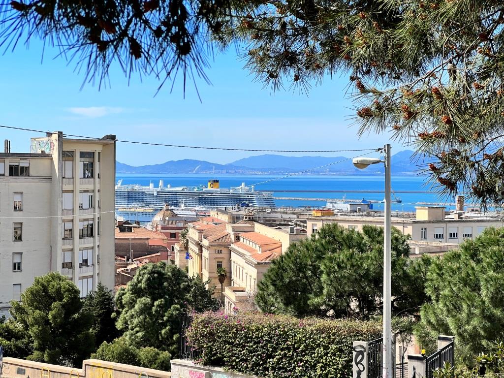 Wir erklimmen die Via Ospendale und kurz darauf die Via Anfiteatro. Ja, es ist echt ein Kraftakt sich hier hoch zu schleppen und mehr wie einmal komme ich in Versuchung, vielleicht doch einen Fahrdienst zu beauftragen, was in Marseille und Barcelona ja auch gut geklappt hat. Aber mit jeder Kurve und jeder neuerlichen Steigung die wir überwinden setzt sich jedes Mal ein selbstbetrügerisches „Jetzt brauchen wir auch kein Taxi mehr!“ durch. Ein kleiner Park mit einer Abkürzung in Form einer Treppe dient als Pausenplatz. Wir lassen uns erschöpft auf die Bank plumpsen und genießen danach die schöne Aussicht auf die Stadt und die Costa Toscana, die den Hafen recht deutlich dominiert.