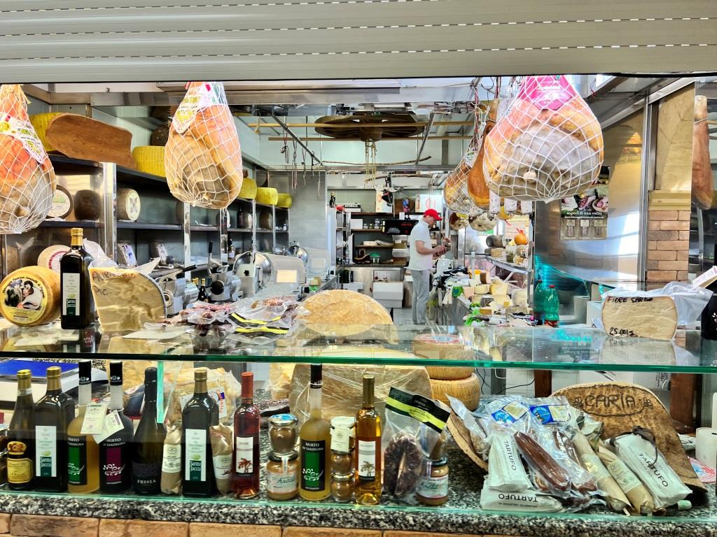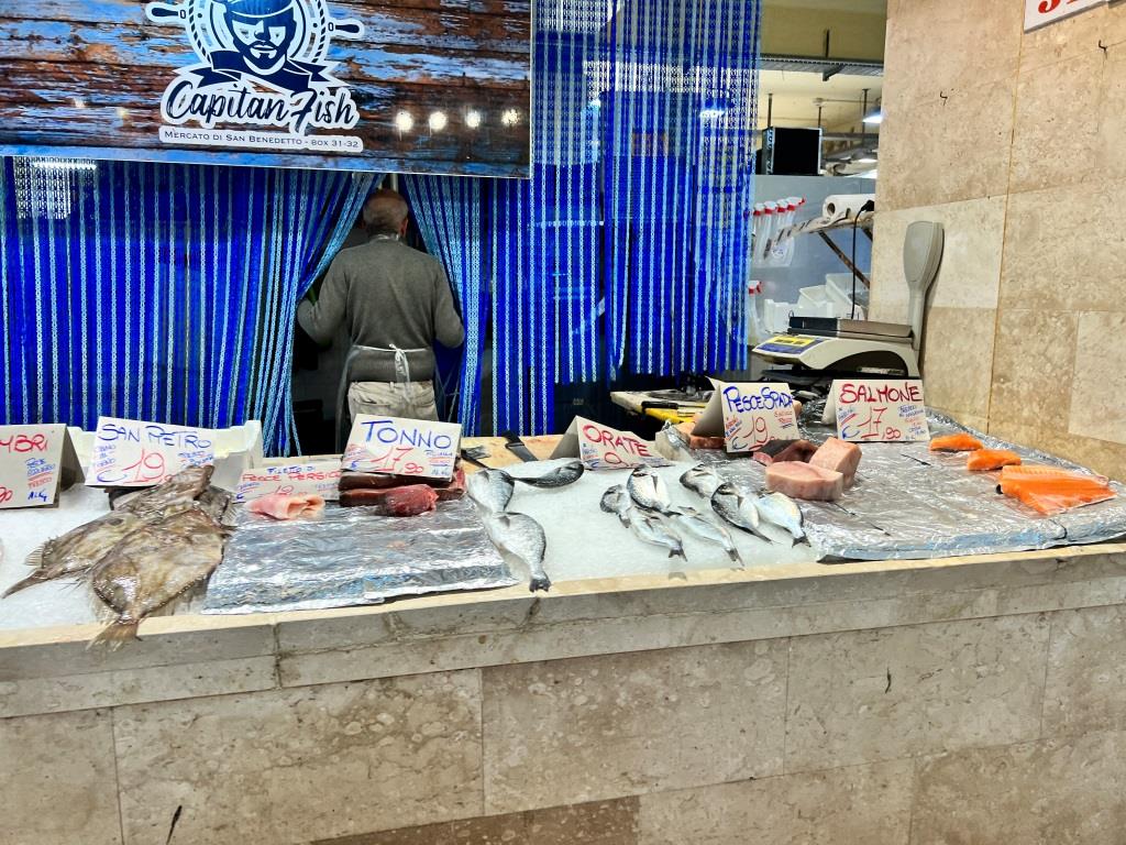 Sofort empfängt uns der Geruch von Fisch! Wobei es nicht Fisch selbst ist (frischer Fisch riecht ja eigentlich nach gar nichts), sondern die Mischung aus Eis, Metall, Salzwasser und Seetang! Und HIER soll man gut Tortellini essen können? Kaum vorstellbar. Aber wir machen uns dennoch auf die Suche und durchforsten jede einzelne Reihe der Gänge, um die Geschäfte abzuklappern. Dabei entdecken wir wirklich allerhand! Bestimmt ein Dutzend Fischhändler. Dazu Gemüse- und Obststände. Auch Backwaren sind zahlreich vertreten. Und Feinkostläden, die ein Potpourri aus allem feilbieten. Aber das gesuchte Restaurant? Fehlanzeige!