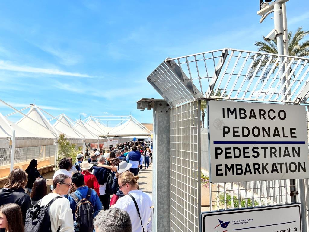 Nach etwa 20 Minuten und der Erkenntnis, dass die Schlange nicht kürzer, sondern länger wird, hat die Hafenverwaltung Cagliari ein Einsehen und öffnet eine weitere Sicherheitsschleuse. Dadurch wird der Bereich im Terminal spürbar entlastet und wir kommen recht zügig in den Genuss ein weiteres Mal unser Hab und Gut nebst Gürtel, Handy und Uhr durch den Röntgenscanner jagen zu dürfen. Kurz schlägt dabei auch mein Herz schneller, was den Sicherheitsoffizier hier offenbar hellhörig werden lässt. Muss der ein gutes Gehör haben! Er lässt mich gleich zwei Mal durch die Sicherheitsschleuse gehen, obwohl es beim ersten Mal schon nicht gepiept hat. Und selbst dann schaut er bohrend und musternd auf mich herab um mit seinem persönlichen Röntgenblick abzuklopfen, ob ich nicht doch eine versteckte Waffe dabei haben könnte. In Anbetracht meiner figurbetonten kurzen Hose und der damit verbundenen Problemzonen (Also eine Waffe zu verstecken! Nicht was ihr gleich wieder denkt! 😉 ) belässt er es dann aber bei einer optischen Kontrolle und verzichtet auf das unangenehme Abtasten. Warum ich wohl leicht nervös wirke, offenbart sich ihm nicht.