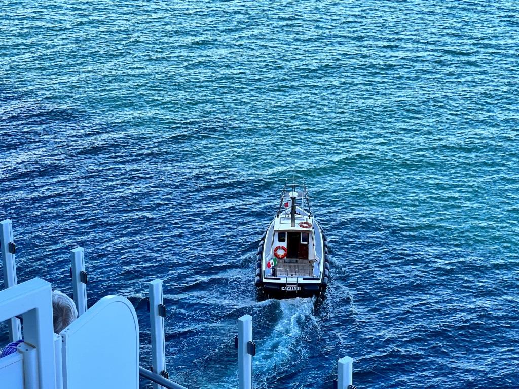 Wir lassen den Nachmittag vorbeiziehen und beobachten das fast pünktliche Auslaufen der Costa Toscana aus dem Hafen von Cagliari von unserem Kabinenbalkon aus. Auch hier im Hafen von Sardinien wird die Ausfahrt offenbar von einem Hafenlotsen durchgeführt, denn kurz nach unserer Ausfahrt kommt ein Lotsenboot längsseits und fährt parallel zu uns, bis wir die Hafenausfahrt erreichen. Der Lotse steigt in das kleine Boot um, das Lotsenboot tutet kurz und dann sind wir frei für die offene See.