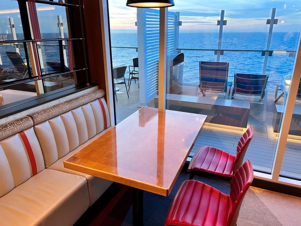 Gegen halb 10 unternehme ich noch einen Spaziergang mit Nils über das Schiff. Unsere inzwischen obligatorische Abendrunde vor der Schlafenszeit sozusagen. Für diese Runde gehen wir dieses Mal aber nicht auf das gewohnte Oberdeck, sondern nochmals auf den Infinity Walk auf Deck 8. Ich möchte gern mal schauen, ob es hier gegenüber dem Oberdeck 16-18 abends ebenso ruhiger ist, wie tagsüber. Tatsächlich sind wir auf Deck 8 fast allein unterwegs. Nur wenige andere Gäste verirren sich hierhin, die meisten Personen hier sind die Angestellten von Costa, die die Liegen zusammenräumen und fixieren für den Fall, dass in der Nacht unerwartet raue See aufkommen sollte. Wir lassen uns in einer der gemütlichen Lounges noch ein Eis von der Eisdiele schmecken, bevor die fleißigen Männer von Costa auch hier die Kissen und Decken von den Sitzgelegenheiten räumen.