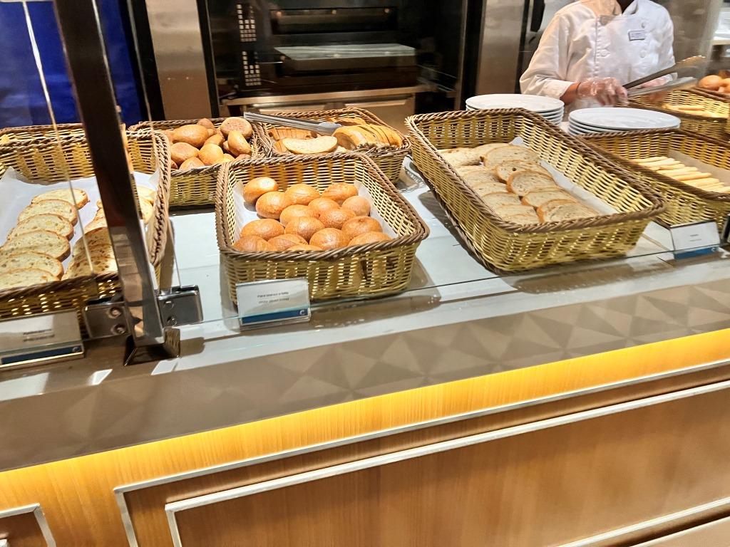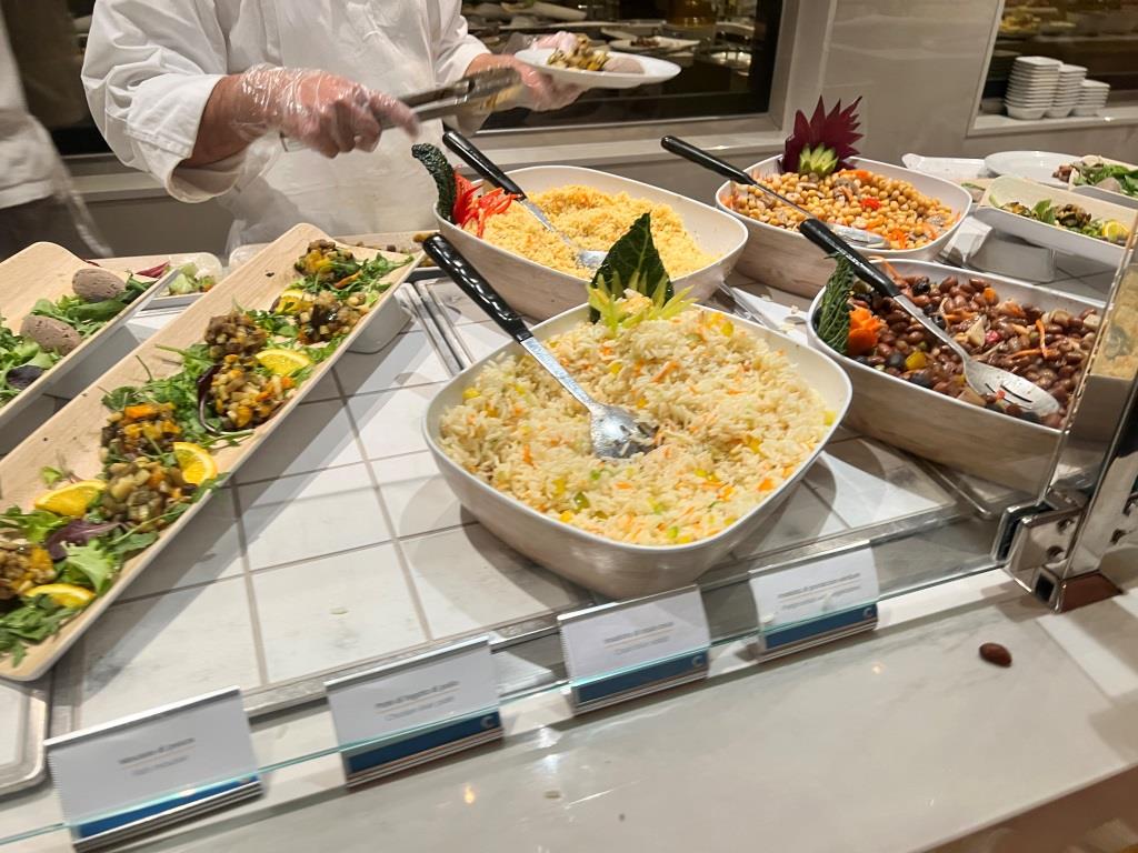 Was die Getränke angeht kann man sich gratis Wasser am Spender selber holen, oder man stellt sich in einer der beiden Getränkeausgaben an. Hier gibt es praktisch Softdrinks, Bier und Wein. Zugang dazu erhält man nach Vorlage der Bordkarte, wo das jeweilige Getränkepaket enthalten ist. Da ich zum Abendessen gerne Cola trinke, habe ich mit meiner Karte kein Problem. Sie wird noch nicht einmal eingescannt wie sonst an der Bar, sondern nur kurz überflogen. Allerdings finde ich es nicht richtig, dass wir mitbekommen, wie einem anderen Gast der Softdrink wie Cola, Fanta und Co verwehrt wird mit der Begründung, dass er eben kein Getränkepaket habe und dafür zahlen müsse. Das kann eigentlich nicht sein! Denn ich meine mich schwer zu erinnern, dass zumindest zu den Mahlzeiten alle Getränke immer frei wären! Doch alles diskutieren nützt nichts, der Mann wird an die kostenlose Wasserausgabe im Nebenbereich verwiesen. Unschön.