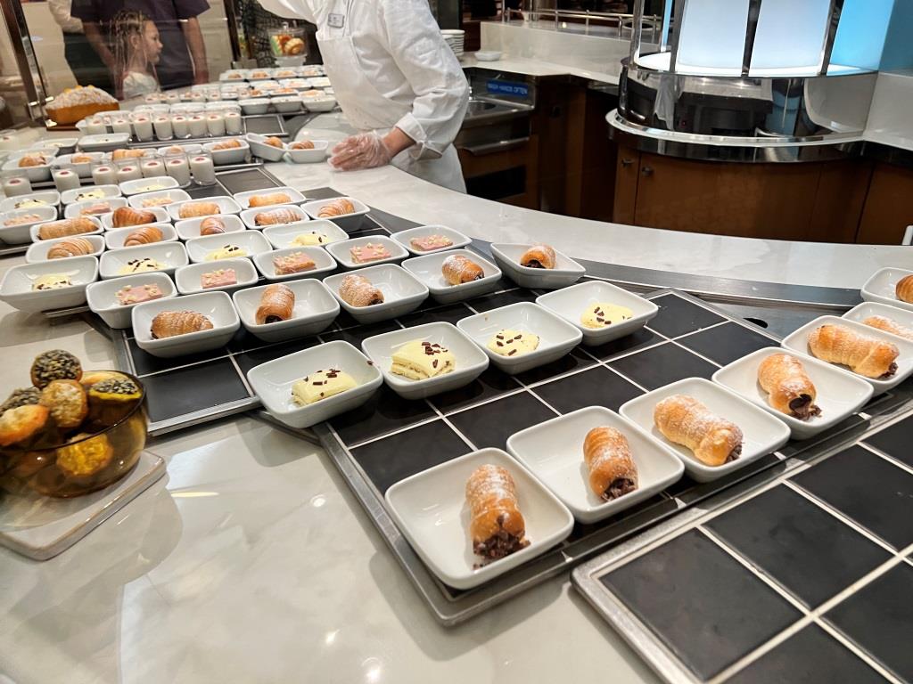 Mit dem Abendessen sind wir nach einer Stunde fertig. Eine völlig normale Zeit für uns, satt und zufrieden geht es zurück zur Kabine. Das hat sich schon gelohnt und war richtig hier zu essen. Besonders die langen Wartezeiten zwischen den einzelnen Gängen haben wir uns gespart. Oder besser: Eingetauscht für Warten IN den Gängen zwischen den einzelnen Essensstationen. Dafür aber haben wir nicht faul herum gesessen und uns bedienen lassen, sondern wenigstens ein paar Schritte auf den Schrittzähler gepackt.