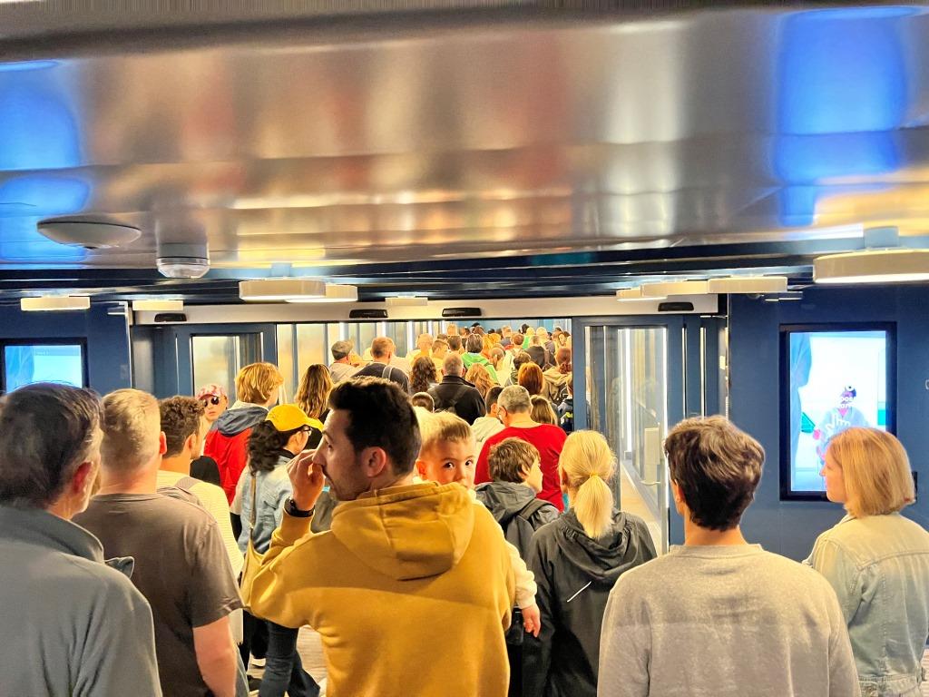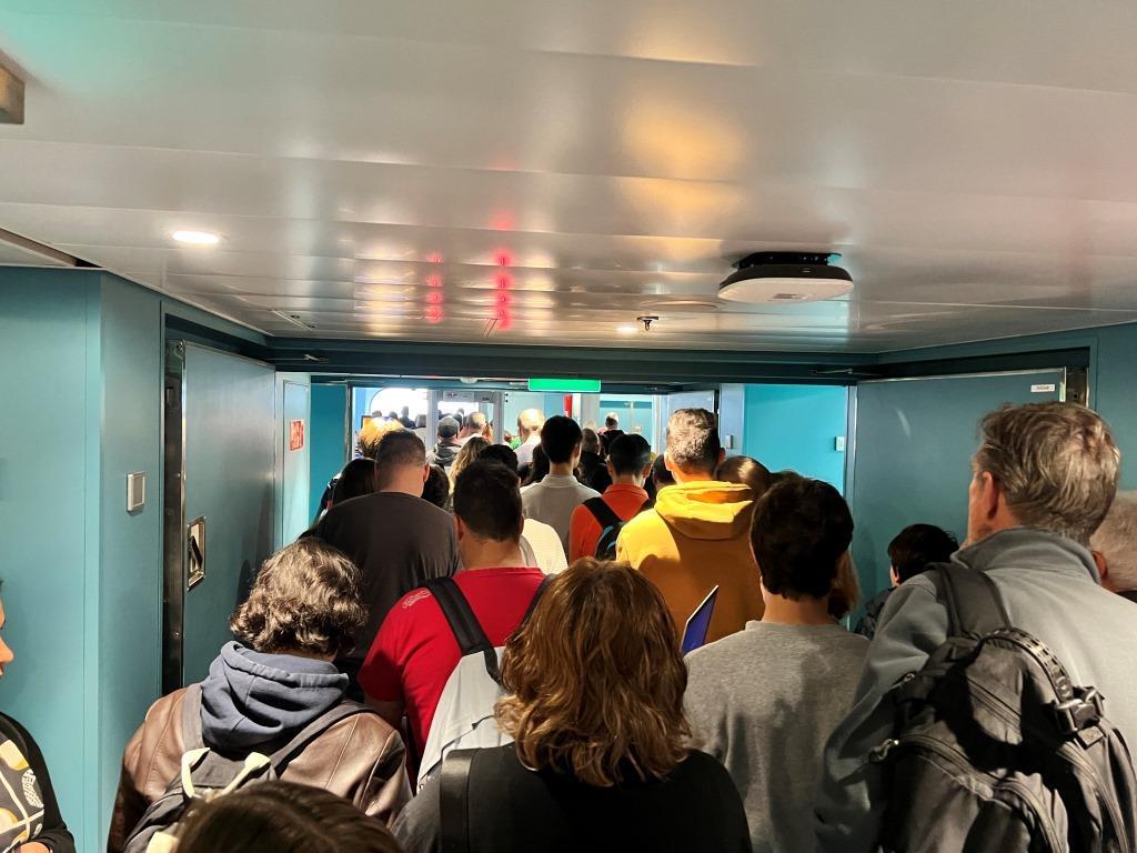 Die Idee das Schiff früh zu verlassen hatten übrigens auch andere! Boah, ist das voll hier im Treppenhaus! An die Nutzung eines Fahrstuhls ist gar nicht zu denken, man würde auf einem Deck einfach stehen bleiben, weil sich die Leute quer in den Kabinen stapeln!