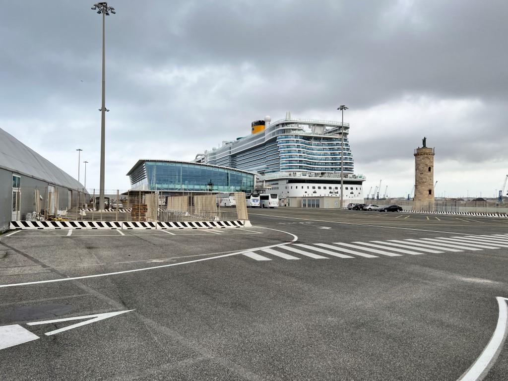 Zu meinem Unbehagen erreichen wir, nachdem wir eine Bushaltestelle und einen Angestelltenparkplatz passiert haben, eine weitere Zugangskontrolle. Dieses Mal die direkte zum Kreuzfahrtkai. Auch hier schiebt ein Italiener Dienst. Leider ist er jung und äußerst dienstbeflissen. Von meiner Costa Bordkarte lässt er sich schon gar nicht beeindrucken und erlaubt mir maximal, den Kai zu Fuß zu betreten. Aber nicht mit einem Privatwagen! Die seien vorne in Höhe des Schiffs unter keinen Umständen zulässig! Wegen Sicherheitsrisiko wie er erklärt. Ich überlege kurz, ob ich mich auf eine Diskussion einlassen soll, aber das bringt wenig! Dafür sind Italiener zu emotional, wenn sie einmal festgefahren sind. Aber auch das noch so schöne Lob und Ode an Italien will ihn einfach nicht umstimmen. Wie gesagt: Junger Sicherheitsbeamter, der seine Karriere noch vor sich hat und die Vorschriften eben penibel umsetzt. An dieser zweiten Schranke kommen wir definitiv nicht vorbei und müssen zurückfahren. Sehr zum Ärger der Limousinenfahrer, die hinter uns in der Schlange stehen und ein wenig ungehalten reagieren* (* = wir erhalten einige typische italienische Emotionen quasi aus erster Hand akustisch wie optisch durch einige offene Fahrzeugfenster vermittelt) als sie sich alle wegen uns zurückbewegen müssen, damit wir rückwärts von der Schranke rausfahren können…
