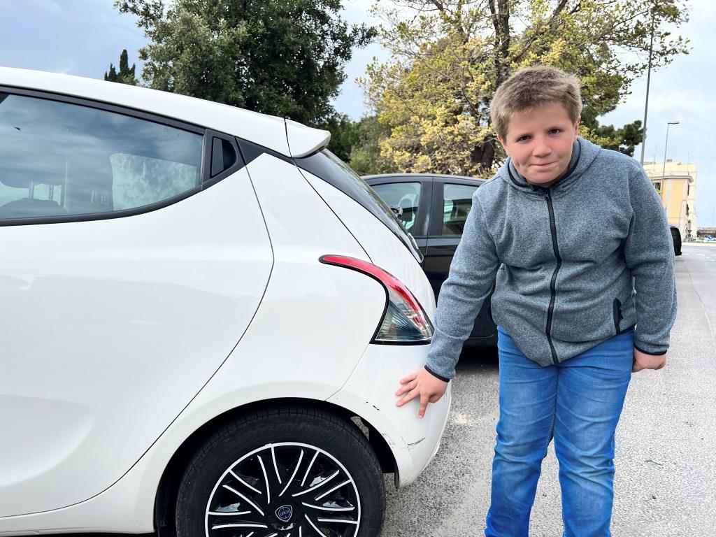 Der in einer Seitenstraße geparkte weiße Lancia Ypsilon ist ein Hybridauto mit Unterstützungsbatterie. Er hat stilecht für Italien einen fetten Kratzer an der hinteren Stoßstange, den wir in mehreren Fotos und einem Video schon jetzt festhalten, damit man ihn uns später nicht anhängen kann. Aber ansonsten macht der kleine Flitzer optisch echt was her und ist zum Beispiel mit dem Mittelcockpit auch ausreichend extravagant, wie man es von einer italienischen Diva erwartet! 😉