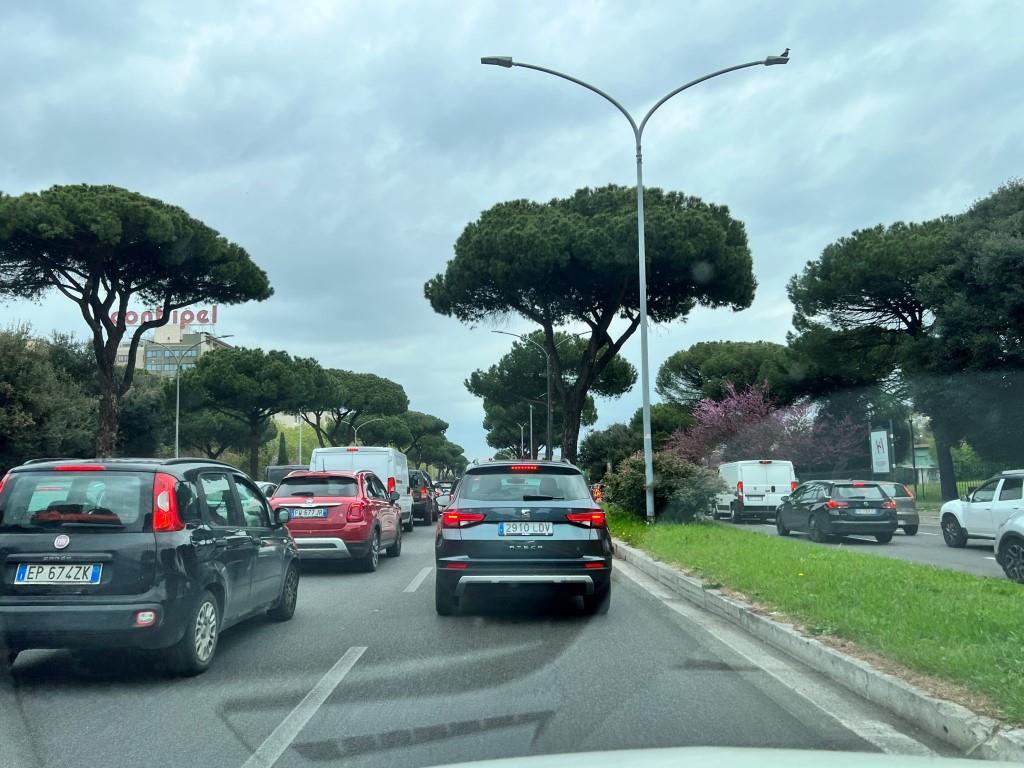 Ich erwähne das mit den zwei Fahrspurblöcken extra, weil im Gegensatz zu den Einheimischen hier unser Google maps hiermit so seine Probleme zu haben scheint! Immer wieder fordert es uns auf, von der linken Fahrspurgruppe auf die rechte Fahrspurgruppe zu wechseln und umgekehrt. Und jedes Mal denken wir, wir müssten aufgrund einer anstehenden Verzweigung oder nahenden Abbiegung auf den jeweils rechten oder linken Fahrspurblock wechseln. Aber das ist nicht der Fall! Und jedes Mal ist es nervig, weil es eben unnötige Spurwechsel bedingt. Warum uns das Google Navi hier entlang lotst, erschließt sich uns nicht. Wir vermuten aber, dass die KI jedes Mal, wenn es auf unserem Fahrspurblock vor uns staut und in der Karte orange wird, wir diese Verkehrsstockung über die parallele Fahrspurgruppe umfahren sollen. Was praktisch natürlich gar nichts bringt! Weil eine vorausgehende Stauung eben auch alle anderen dazu bringt, auf die jeweils andere Fahrspurgruppe zu wechseln. Unter Einsatz des Signalhorns versteht sich! Es ist so nervig, MADONNA, dass es fast schon wieder Spass macht! Anfangs fühle ich mich noch jedes Mal auf eine drohende Gefahr hingewiesen. So, wie wir in Deutschland eben in letzter Instanz vor einer drohenden Gefahr hupen würden, um einen Unfall zu vermeiden! Weil uns der andere Verkehrsteilnehmer vielleicht übersehen hat. Ich schaue mich auch brav jedes Mal um und entschuldige mich auch jedes Mal schon vorauseilend, obwohl ich bei genauer Betrachtung gar keine gefährliche Situation ausmachen kann! Bis ich endlich wieder im „Italien- Modus“ ankomme und kapiere! HALLO! DAS IST HIER ROM!! ROOOOMMM! Hier gehört hupen zum guten Ton! Und von da an mache ich ebenfalls nach Herzenslust vom Signalhorn Gebrauch, wenn meiner Meinung nach der Schnarchbär vor mir nicht schnell genug die Spur wechselt. Ganze 16 Mal (!) werde ich hier auf der Via Cristoforo Colombo das Signalhorn erklingen lassen. Ein anderer Italiener in einem Alfa Romeo 156, nickt mir für den maßvollen aber berechtigten Einsatz des Signalhorns im weiteren Verkehrsverlauf sogar anerkennend zu! 😉