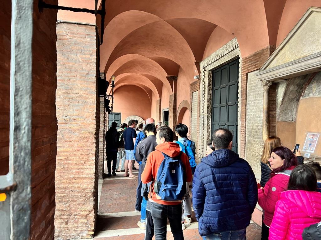 Nun, zurück zu dieser Reise! Von der aus der Erinnerung verklärten Szenerie des Kolosseums ist so ziemlich nichts, aber auch GAR NICHTS übrig, als wir uns dem Kolosseum nähern. Hammer! Ist das VOLL hier! So viele Menschen! Aus aller Herren Länder! Gut, es ist das Osterwochenende! Wir wussten vorher, dass es voll werden würde. Ohne festen Kreuzfahrtkalender hätten wir sicher einen anderen Wochentag für unseren Besuch ausgewählt. Nützt ja nichts. Aber so voll! Puh! Noch bevor wir überhaupt in die Nähe des Kolosseums gelangen, werden wir schon von allerlei offiziell wirkenden Fremdenführern mit Namensschildern am wichtig aussehenden Band um den Hals aufgefordert, bei ihm Zugangskarten für die nächsten Stunden zu kaufen. Diese fliegenden Händler gab es damals aber nicht! Zumindest nicht in diesem Ausmaß! Wir wissen natürlich als Reiseprofis, dass man diese Händler am besten links liegen lässt und straight zum offiziellen Kartenverkauf durchmarschiert.