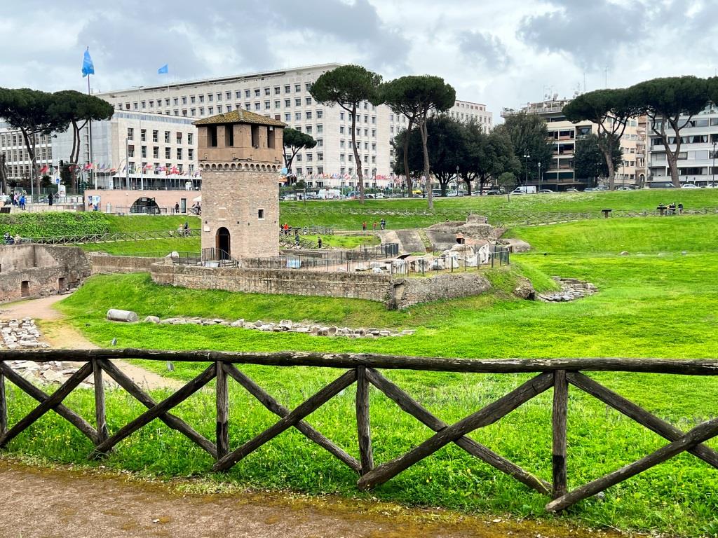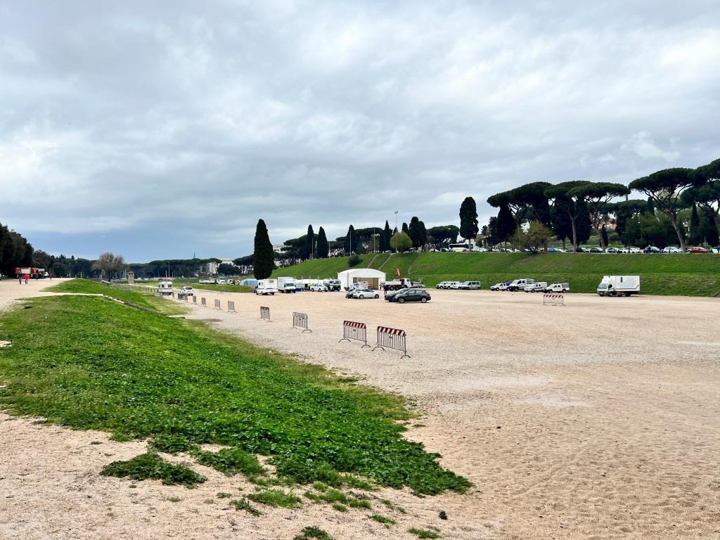 Zu sehen von Angeboten für „Touristenfahrten“, wie es sie zum Beispiel auf der alten Nordschleife des Nürburgrings gibt, ist hier jedoch nichts. Wir spazieren also den Circus Maximus einmal der Länge entlang, weil der Weg zum Auto sowieso hier entlang führt. Würde man nicht wissen, dass es sich um eine 2000 Jahre alte Kampfarena handelt, würde man es wohl für irgendeine Mulde halten und gar nicht weiter beachten. Allenfalls das typisch im römischen Stil gebaute Türmchen am südöstlichen Ende der Arena deutet auf die antike Vergangenheit hin.