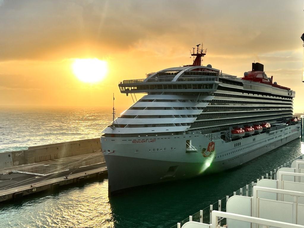 Gegen 18:10 Uhr legt die stolze Costa Toscana kraftvoll vom Kai ab. Die ersten Meter gleitet sich noch durch das Hafenbecken, dabei nähern wir uns auf dem Weg zur offenen See wieder der „Resilient Lady“ der Virgin Cruises, die hier noch immer genau so unbewegt am Kai liegt, wie wir sie heute früh bei der Einfahrt vorgefunden haben. Sieht toll aus, wie die Sonne hinter ihr durch die Fenster des Schiffs spiegelt! Ein richtiger Kreuzfahrt- Fernwehmoment das Auslaufen hier im Hafen!