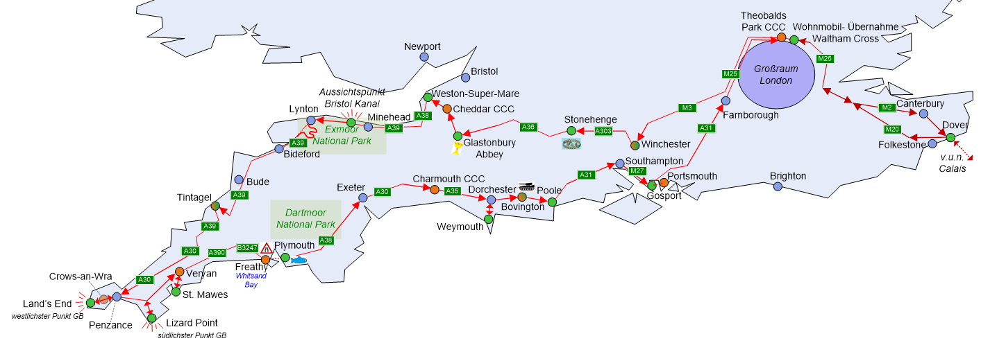 Darauf eingezeichnet findet ihr ganz grob unsere Route. Ihr werdet sehen, dass wir uns an die Vorgabe „Südengland“ sehr streng gehalten haben und zu keinem Zeitpunkt nördlich nicht weiter als London bzw. Weston-Super-Mare und den Bristol- Kanal gekommen sind.
