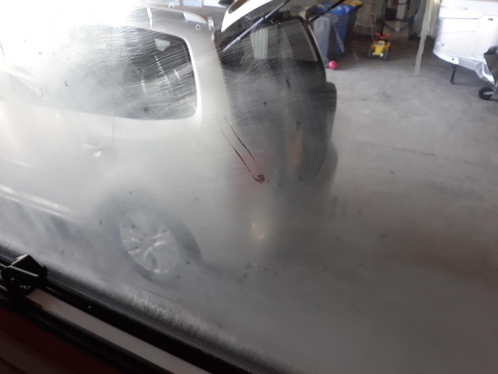 Natürlich versuchten wir, nachdem wir den Wohnwagen abgeholt hatten und auch Vordermann bringen wollten, auch das Fenster zu putzen! Zunächst natürlich vorsichtig mit Seifenlauge und weichen Haushaltstüchern! Wir möchten ja das teure Wohnwagenfenster nicht zerkratzen! Doch das Fenster zeigte sich von dieser sanften Reinigung völlig unbeeindruckt!