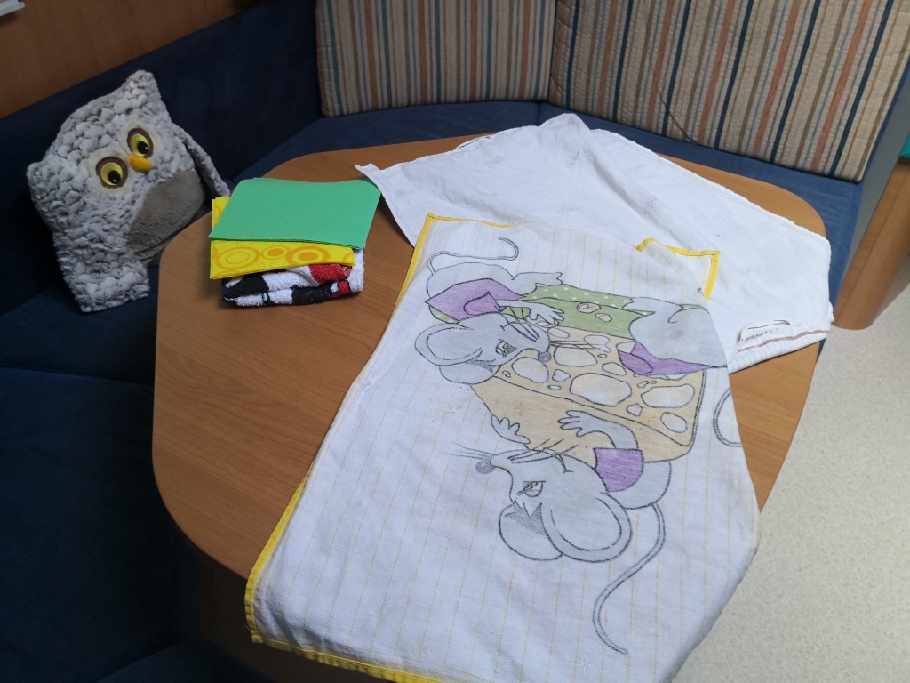 - Auf dem Wohnwagentisch liegen einige Tücher