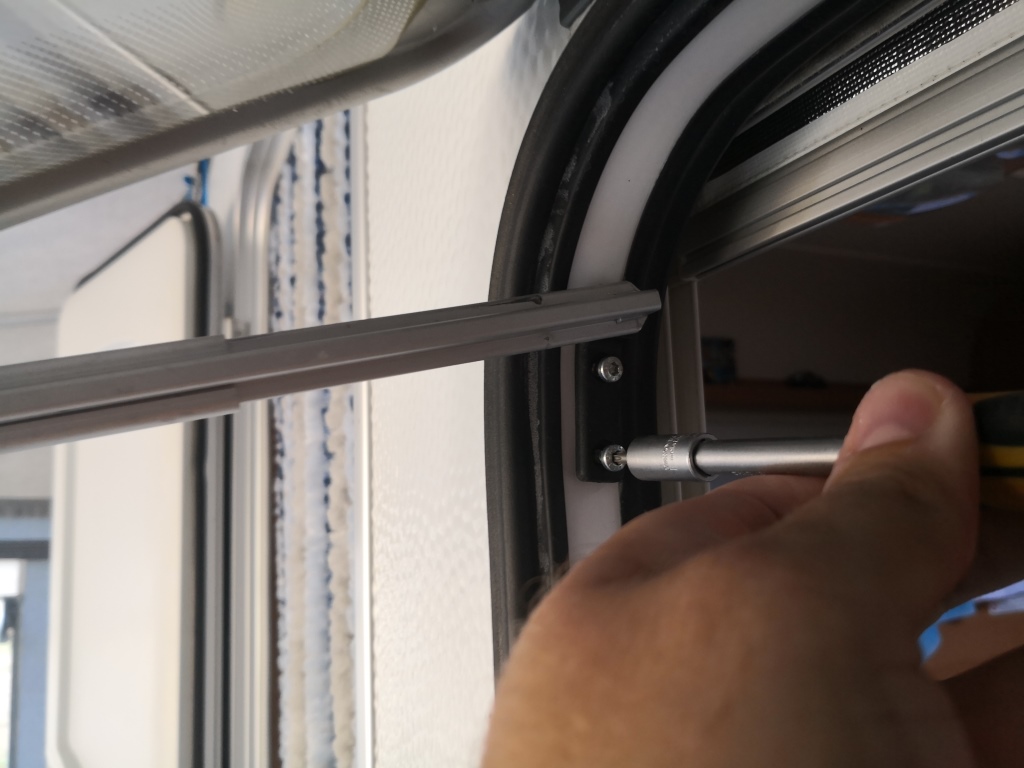 Nachdem ihr das Fenster wieder eingeschoben hat, richtet es vorsichtig so aus, dass die Halter wieder an den alten Stellen im Innenrahmen des Wohnwagens verschraubt werden können. Wenn ihr wollt, könnt ihr etwas Dekalin Dekaseal 8936auf die Schraubenspitzen geben. Damit halten sie den alten Löchern etwas besser und dichten zusätzlich ab. Nötig ist dies aber nicht zwingend.