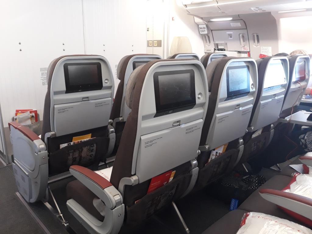 Zum Glück ist die Maschine nur etwa zur Hälfte belegt! Wäre sie voll, wäre das Gefühl drangvoller Enge noch deutlich schlimmer. Hinter uns die Reihe ist aber zum Beispiel komplett frei! Da können wir nachher ohne schlechtes Gewissen zumindest die Rückenlehne nach hinten klappen, ohne dass dem Hintermann der Kaffee auf die gute Armani- Hose kippt.