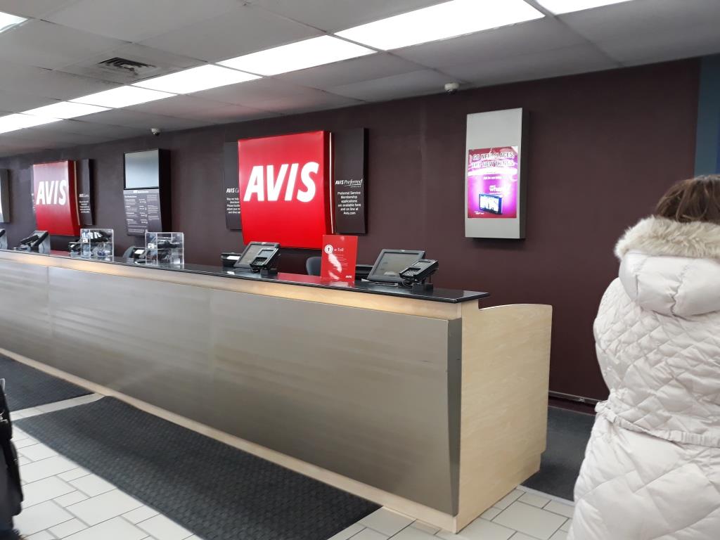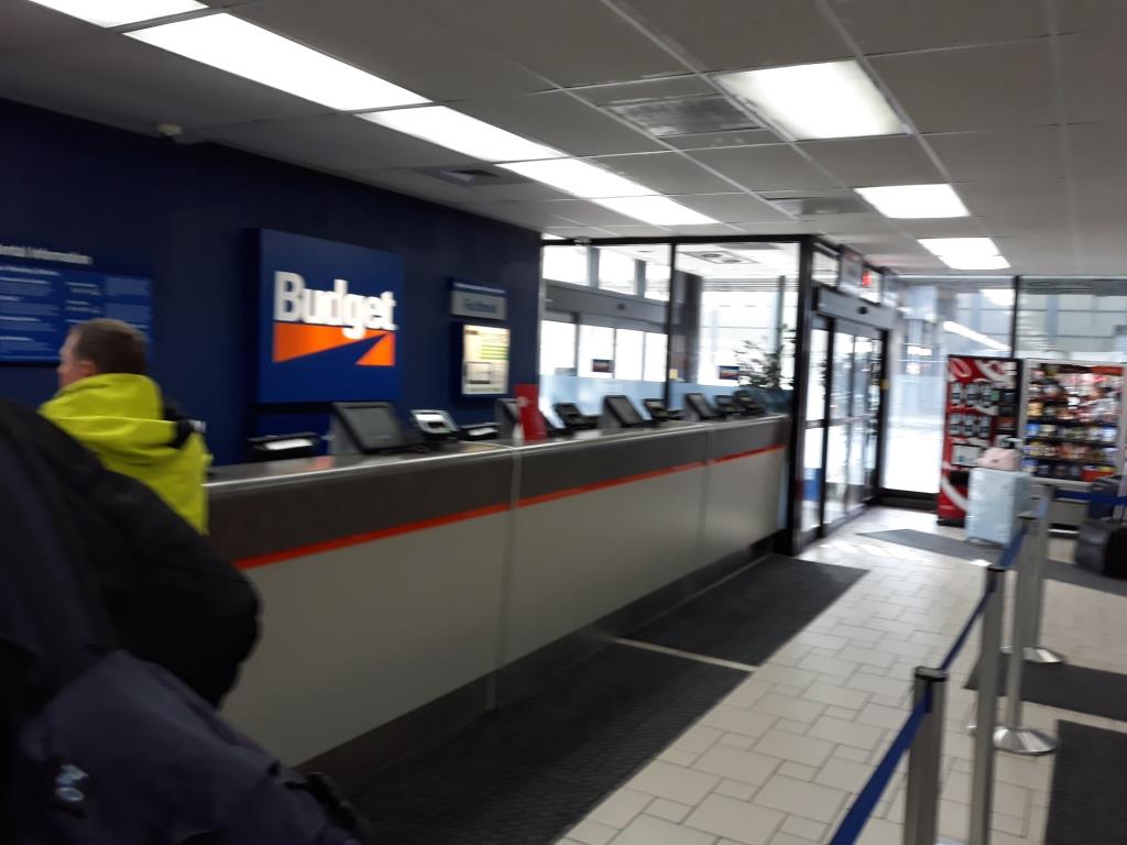 Wir steigen in den Bus und rumpeln die paar Meter zum Mietwagenstand. Von google Maps wusste ich, dass er eigentlich nur schräg gegenüber liegt. Man hätte auch „walk in“ machen können. Hätten wir gemacht, wenn man den Mietwagenkiosk gesehen hätte! Aber hier ist alles so bullig und groß, dass man den eigentlich keine 300m entfernt liegenden Kiosk von Avis/Budget nicht erspähen kann. Zumal es auch keinen einfachen Fußgängerweg dorthin über die mehrspurige Straße gibt. Mit Kindern und Gepäck ohne vernünftigen Überweg? Keine Chance!