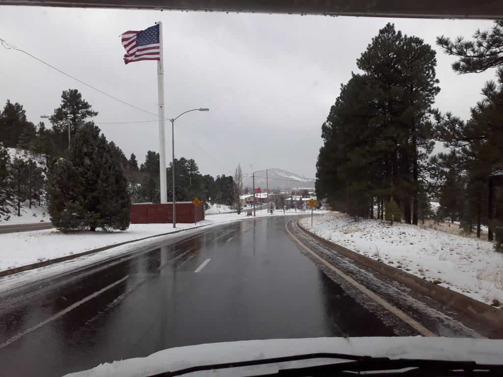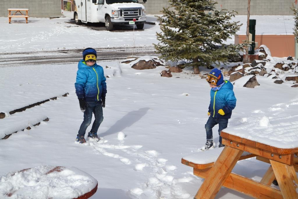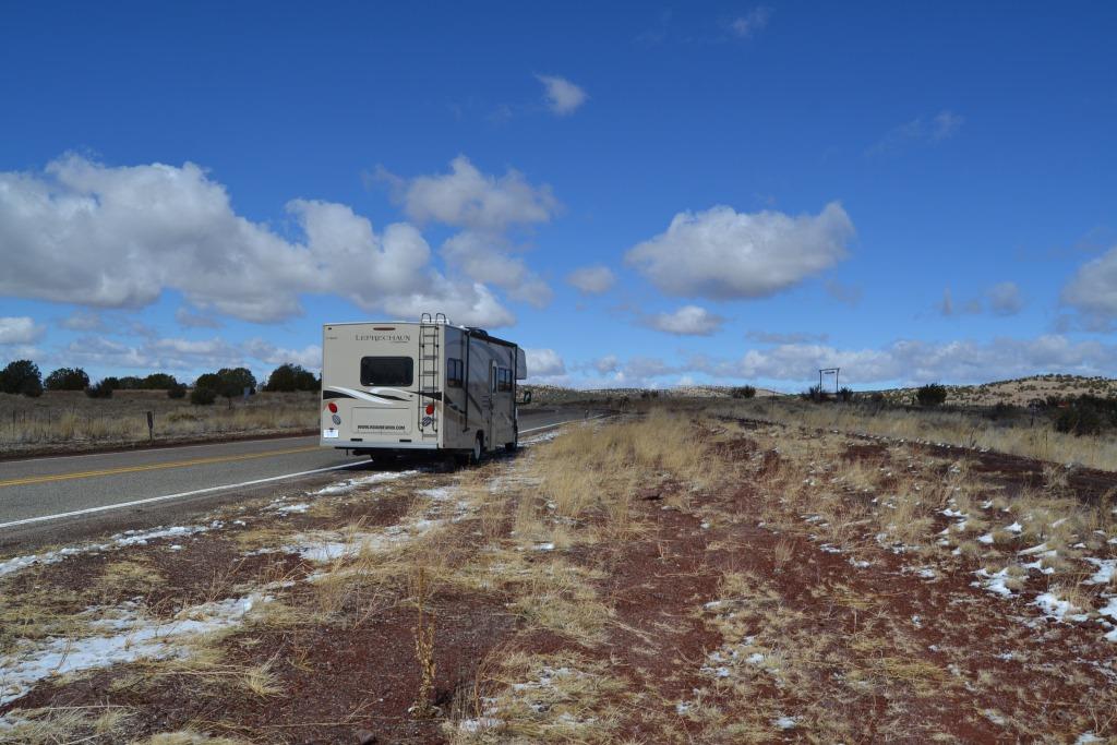 Wir haben uns über die Road Conditions während des Frühstücks informiert und aufgrund der winterlichen Verhältnisse auf der Zufahrtsstraße und am Grand Canyon selbst haben wir uns schweren Herzens entschlossen, den Grand Canyon ausfallen zu lassen. Nützt nichts! Der Grand Canyon würde nochmals eine Bergkletterei bis auf 2300m rauf bedeuten und es liegt ja schon hier in Williams Schnee, der in der Frühe mit dem Schneeschieber am Pick-up Truck auf die Seite geschoben wurde. Mit einem PKW könnte man die Fahrt sicherlich noch angehen, aber mit einem Wohnmobil?! Das wird uns einfach zu heikel! Auch, wenn wir unseren Kindern wirklich sehr sehr gerne diese Möglichkeit eingeräumt hätten, dieses monumentale Naturschauspiel einmal in Natura zu zeigen. Für die Bucket List und so.