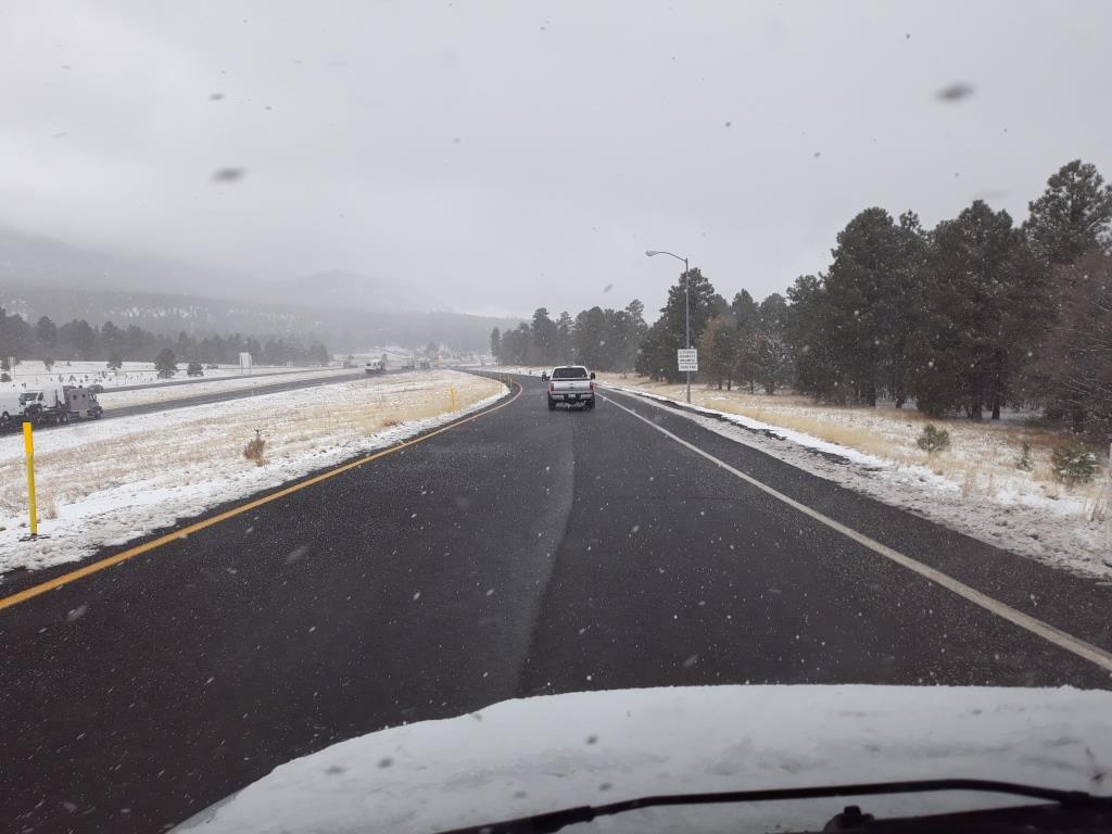 - Auffahrt auf den Highway! Es schneit wieder! Da fahren wir besser nach Westen als noch höher hinauf.