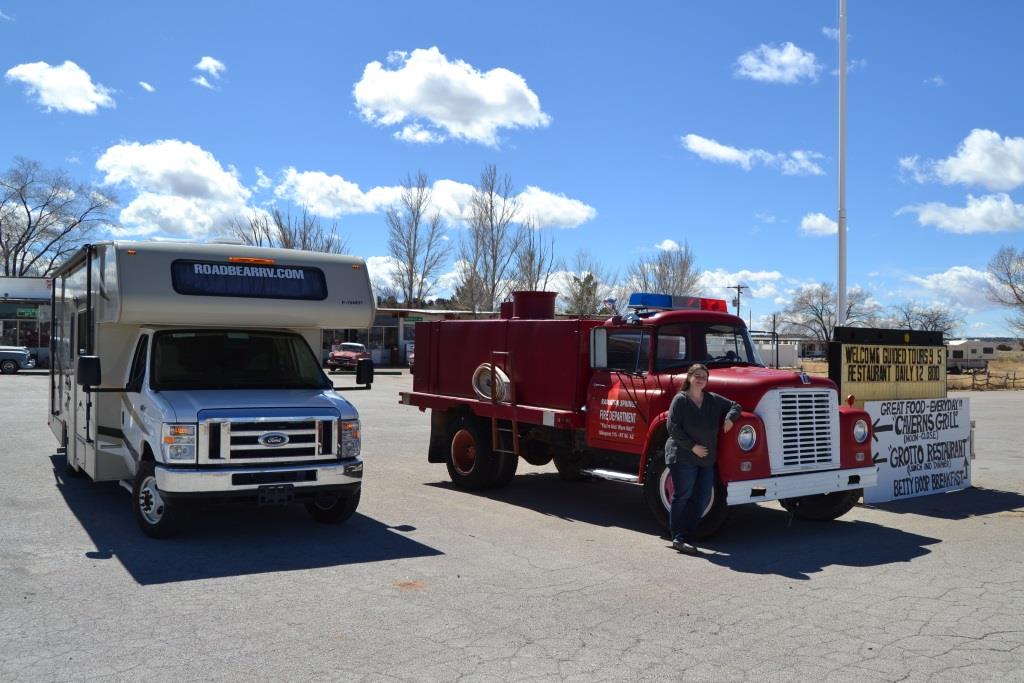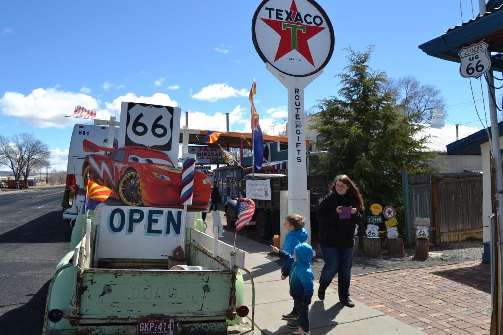 Auf unserer Route für die nächsten Stunden liegen einige Örtchen, die unser Reiseführer für einen Besuch empfiehlt. Unter anderem soll es eine Häufung der Burma Shave Werbetafeln geben, dazu wartet Peach Springs und Hackberry auf Touristen. Auch die Grand Canyon Caverns, also eine Art Höhlensystem liegt auf unserer Strecke. Der Name „Grand Canyon“ ist dabei nicht übertrieben, angeblich sollen die Höhlen hier tatsächlich mit dem Grand Canyon verbunden sein, obwohl dieser von den Caverns gut und gerne 200km entfernt liegt! Wir hatten kurz überlegt, ob wir uns die Höhlen anschauen sollten. Haben uns dann aber doch dagegen entschieden. Wenn die Kinder in der Erinnerung etwas mit „Grand Canyon“ verbinden wäre es blöd, wenn dies Höhlen und eben kein großer Canyon ist. So beschränken wir uns auf eine Runde auf dem Areal, um den alten Feuerwehrwagen oder die „Radiator Springs“ Tankstelle anzusteuern. Auch hier hat man versucht, auf den „Disney Cars“ Zug aufzuspringen. Leider nur recht halbherzig. Wie gesagt machen ein paar gemalte Augen auf weiß beschichtete Fensterscheiben der Autos noch keine gut gemachte Replik der Autos aus den Filmen. Und ein paar Buchstaben in der richtigen Reihenfolge angereiht, machen aus einer verlotterten Tankstelle eben noch kein Flo´s V8 Cafe…