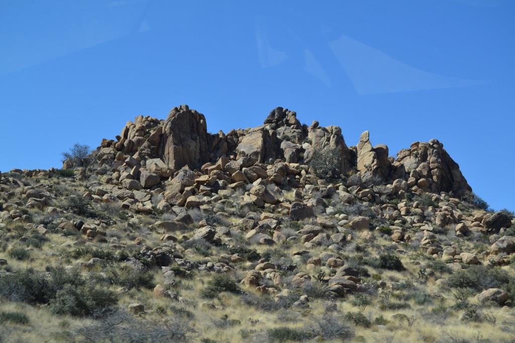 Den Grund, warum die Interstate einen Schwenk nach Süden und die Route 66 nebst Eisenbahnstrecke einen Schwenk nach Norden macht, entdecken wir einige Meilen später am Horizont voraus. Es wird bergig! Die wüstenähnliche, steinig- sandige Landschaft um uns herum wird etwas bewachsener und grüner. Wir nehmen wieder ein paar Höhenmeter unter die Räder unseres Wohnmobils, die uns aber überhaupt keine Probleme bereiten. Unser dicker Motor genehmigt sich einfach einen guten Schluck mehr aus dem Tank und dann prescht er, derart gut gestärkt, ungestüm nach vorn.