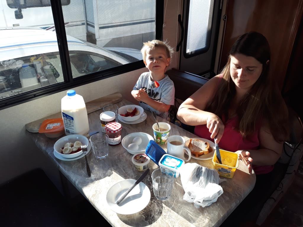 Gegen 8 Uhr gibt es ein letztes schnelles Frühstück im Wohnmobil. Die letzte Kanne frische Milch und die letzten Reste farbstoffstrotzender Frühstückscerealien finden zueinander, sodass die Kinder ein letztes Mal Captain Crunch zum Frühstück begrüßen können. Dazu geben wir frische Bananenstücke, damit wir es vor unserem elterlichen Gewissen als „Müsli“ verkaufen können… 😉