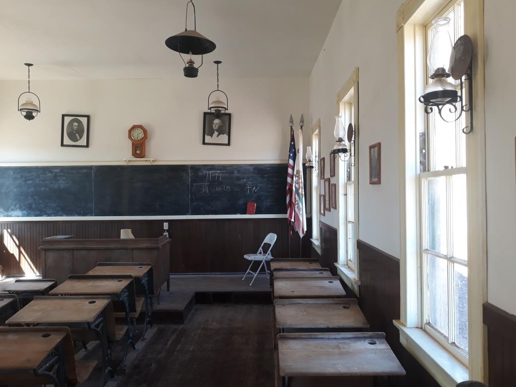 Im Innern der Schule dominiert natürlich die nüchterne wie zweckmäßig Holzeinrichtung mit starren Holzbänken (Einzeltische übrigens), eine große Tafel, Bilder von mindestens einem Präsidenten, eine amerikanische Flagge und natürlich eine Wanduhr.