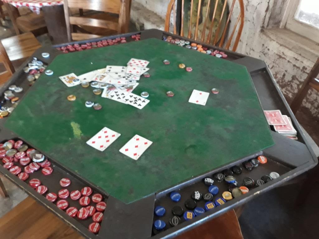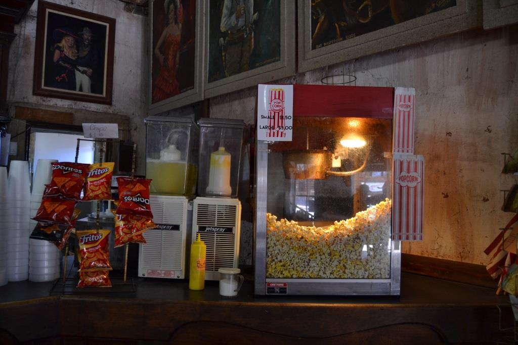 Die Inneneinrichtung ist authentisch. Sowohl, was eine Snackbar angeht, als auch die Dekoration des Saloons selbst. Wir entdecken zum Beispiel echte Handfeuerwaffen in kleinen Vitrinen und Schaukästen. Dazu einige Spieltische für Poker und Spielkarten an der Decke, die hier offenbar früher so manchem Falschspieler die Finger oder vielleicht sogar in einem Duell direkt das Leben gekostet haben!