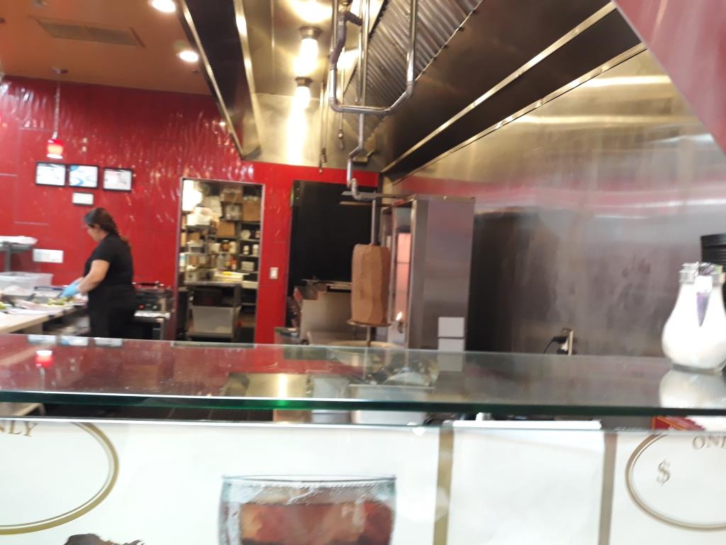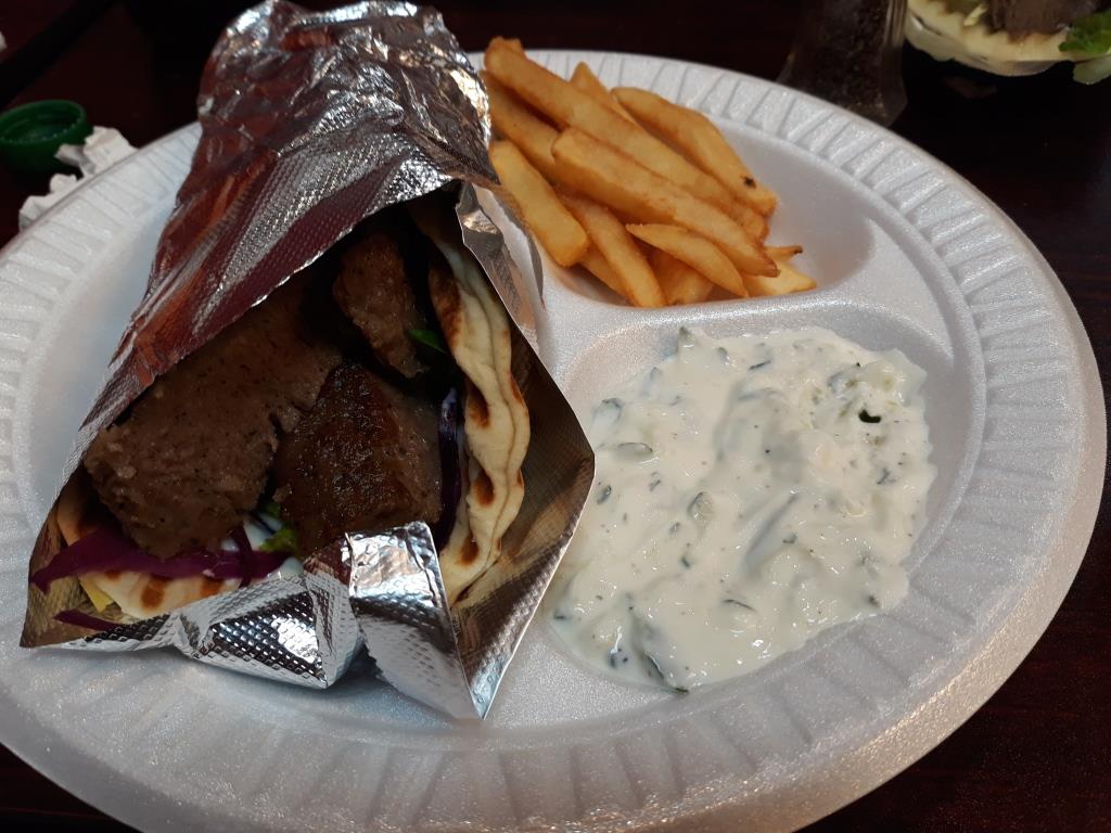 Der Laden ist sehr gut besucht (offenbar gibt es hier nicht viele Angebote an günstigem Essen und Imbiss) und es dauert einen Moment, bis ein Tisch frei wird, an den wir uns setzen können. Dann aber bestellen wir uns lassen uns gute 10 Minuten später den Drehspieß- Gyros mit einer kleinen Hand Pommes und Tsatsiki schmecken.