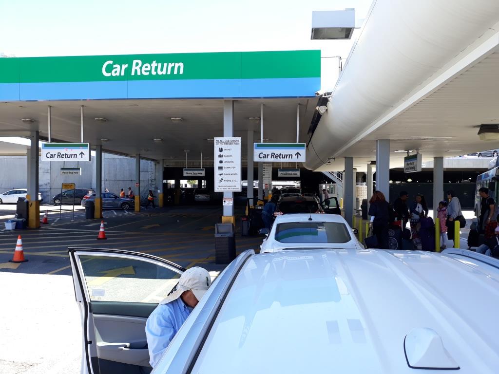 Kaum sind die Koffer verladen und Anja mit den Jungs in der Abflughalle, bringe ich das Auto zurück. Und das ist nochmals eine richtig langwierige und quälende Angelegenheit! Der Weg zum Car Rental Return dauert eine gute Viertelstunde! Dabei ist das große Areal, wo National und Alamo die Autos an der Ecke Aviation Boulevard / West Hillcrest Boulevard zurücknehmen, nur etwa 4km entfernt. Trotzdem fühlt sich die Fahrt so an, als würde man einmal die komplette Großstadt von Los Angeles durchqueren.