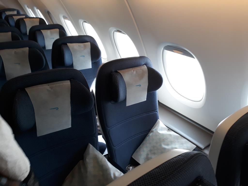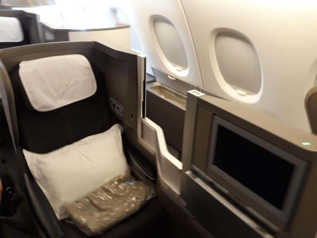 Wir werden freundlich von einem Steward und einer Stewardess begrüßt. Die Dame ist offenbar erfahren und voller Professionalität. Ihr ist nichts anzumerken, dass Sie weniger über unser Erscheinen erbaut ist. Der Steward zieht schon eher einen genervten Gesichtsausdruck, aber auch er fängt sich schnell. Tim und Nils werden freundlich begrüßt, dann werden wir gebeten, durch den vorderen Teil durchzugehen, bis wir im hinteren Bereich unsere Plätze finden. Schade. Sehr gerne wäre ich hier im vorderen Teil geblieben! Business! Schöne Einzelsitze mit Trennwänden und der Möglichkeit, auch mal die Beine lang zu machen. Wir es dann gleich in der Holzklasse wird, werden wir sehen…