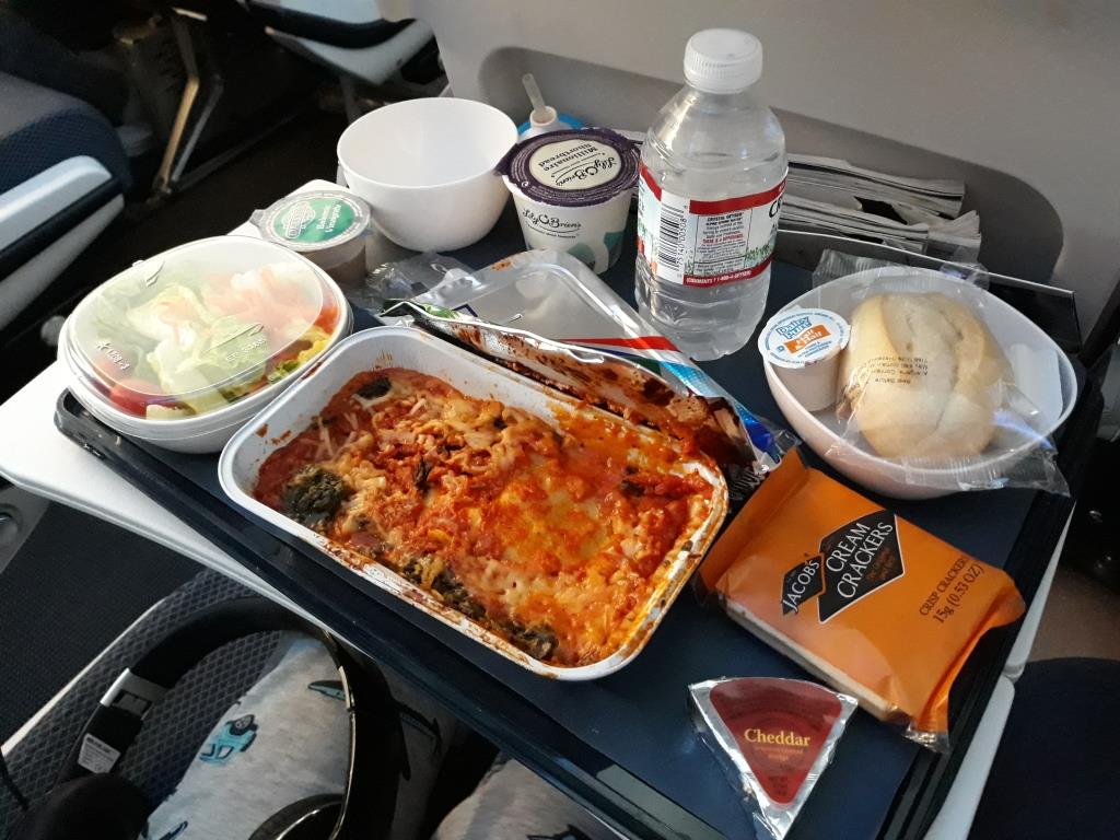 Es gibt entweder eine Lasagne oder ein Reisgericht zur Auswahl. Dazu einen kleinen Salat mit einem separaten Döschen Dressing, ein Fläschchen Wein, ein Fläschchen Wasser, ein Brötchen, ein Tütchen mit Crackern, ein Schmelzkäse- Eckchen und etwas Margarine. Es ist sogar fast so viel, dass man davon fast satt wird. 😉