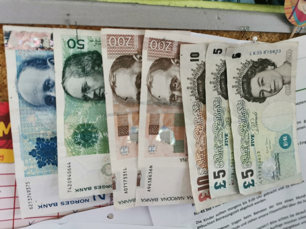 - mit dabei: Britische Pfund! Die aber nicht mehr angenommen werden! Warum? Ist die Queen nicht mehr Königin oder was?!