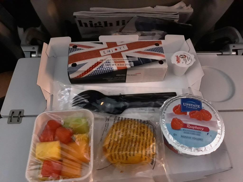 Flankiert wird die in britischen Farben gehaltente Pappschachtel von einem Brombeerjoghurt, ein kleines Kuchenstück und eine Schale mit Obst. Kein schlechtes Menü! Zwar macht es selbst Nils nicht satt, aber durch unseren aktuellen Biorhythmus, das Essen wird uns um halb 1 Ortszeit Los Angeles serviert, sind wir sowieso nicht auf Essen vorbereitet. Es fühlt sich komisch an, „mitten in der Nacht“ zu essen. Der Magen reagiert unwirsch und fragt sicherheitshalber oben nach: „Ist das dein Ernst? Frühstück? Jetzt?“ 😉