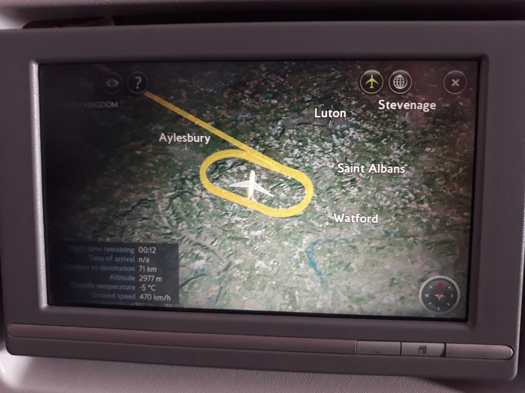 Das Entertainment- System des Fluges lässt übrigens unsere baldige Ankunft erwarten! Das britische Festland mit Londonderry ist schon deutlich auf der kleinen Weltkarte unter unserem Flieger zu erkennen. Und da wir mir über 960 km/h auf London zurasen, kann die restliche Flugdauer nun gar nicht mehr so lang sein! So langsam müsste der Kapitän unseren riesigen Vogel vielleicht auch mal bremsen! Sonst fliegen wir noch an London vorbei und landen in Oslo oder so!