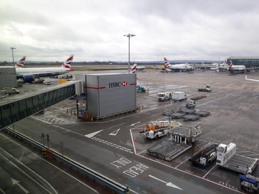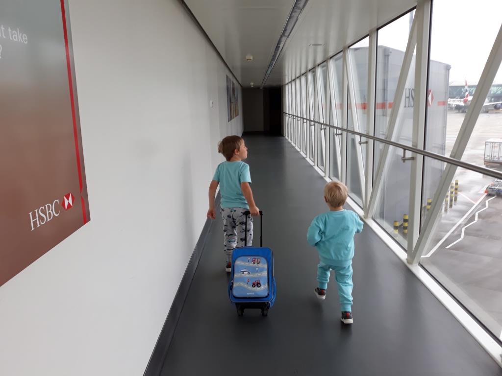 Zum Glück fand die Kontrolle auf dem Obergeschoss des Terminals 5 statt, sodass wir jetzt von oben für ein paar Sekunden eine ruhige Ecke ausspionieren können, bevor uns die Rolltreppe unweigerlich nach unten in die Masse der Leute befördern wird! Instinktiv greifen Anja und ich die Hände unserer Jungs etwas fester…