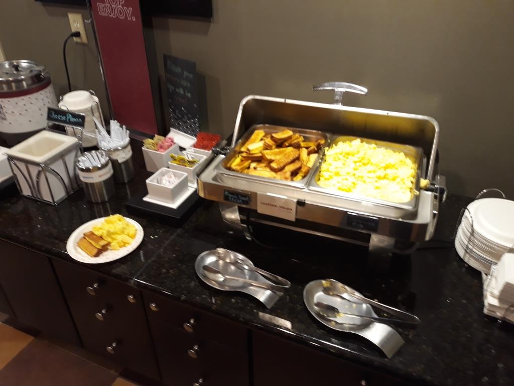 Das Frühstück ist lecker und reichhaltig wie gestern. Zwar gibt es keinen Pfannkuchenautomaten wie in Chicago, dafür aber ein richtig schweres Waffeleisen und eine Fertigteigmischung, aus der man sich mit einem Becher die exakt benötigte Menge für eine leckere Frühstückswaffel abfüllen kann. Dann kippt man den Teig ins Waffeleisen, dreht es um und wenn der Timer piept, dreht man das Eisen zurück und hat eine herrlich leckere Waffel. Dort kann dann drauf, was gefällt. Sirup, Flüssigschokolade, Honig, Marmelade, Erdnussbutter oder auch Zucker oder Sahne!