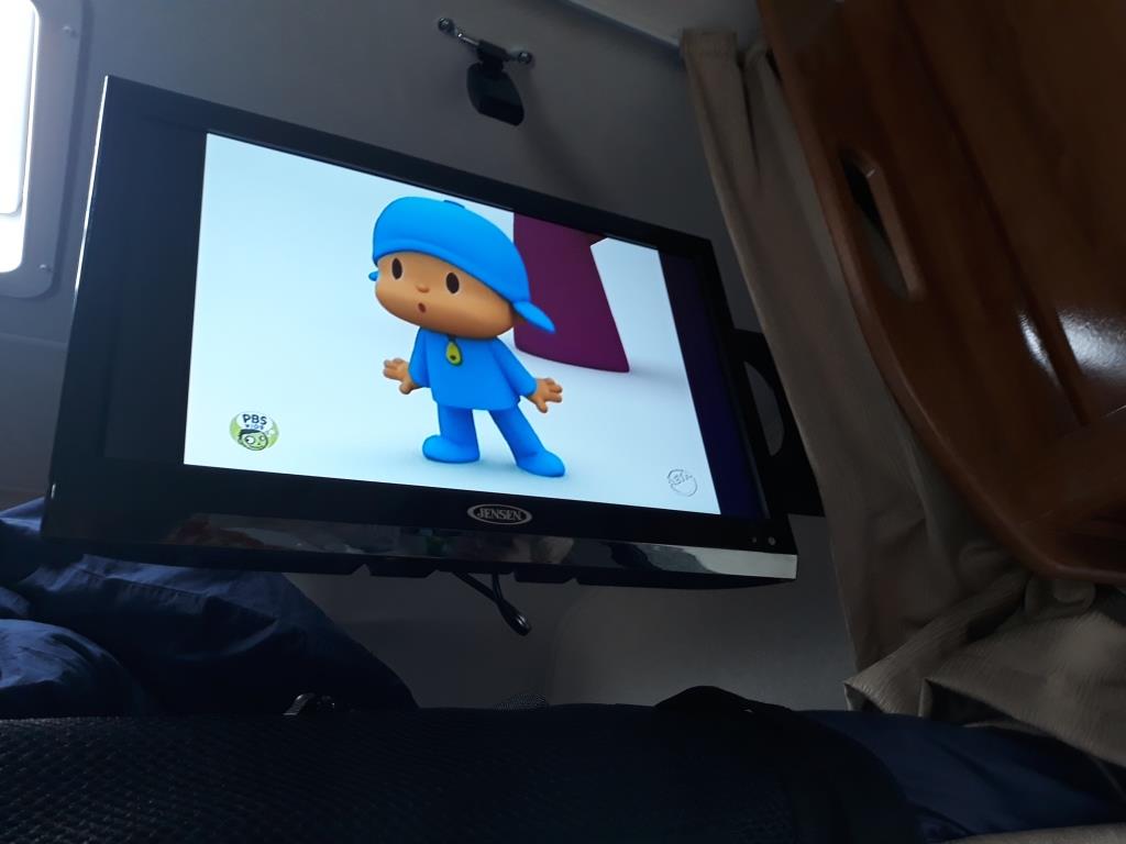 Heute Nachmittag hatte ich es mal spontan probiert mit dem Fernseher und quasi sofort nach dem Einschalten und Suchlauf an die 40 Sender auf den Fernsehschirm bekommen! Das ist mal allerdings proud american! Auch jetzt klappt das Fernsehprogramm sofort tadellos. Spannend wird sein, was von dem Angebot noch übrig ist, wenn wir später mal mitten in der Pampa stehen. Für den Moment aber freuen sich die Jungs über ein paar Cartoons, die zwar natürlich in englischer Sprache ausgeführt sind, aber für Cartoons braucht man nicht wirklich ein Sprachverständnis. Wenn der Zeichentrickkatze der Zwei- Zentner Amboss auf den Fuß fällt, ist das in jeder Sprache witzig! 😉