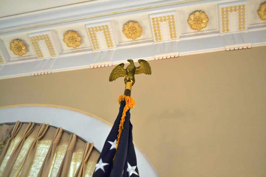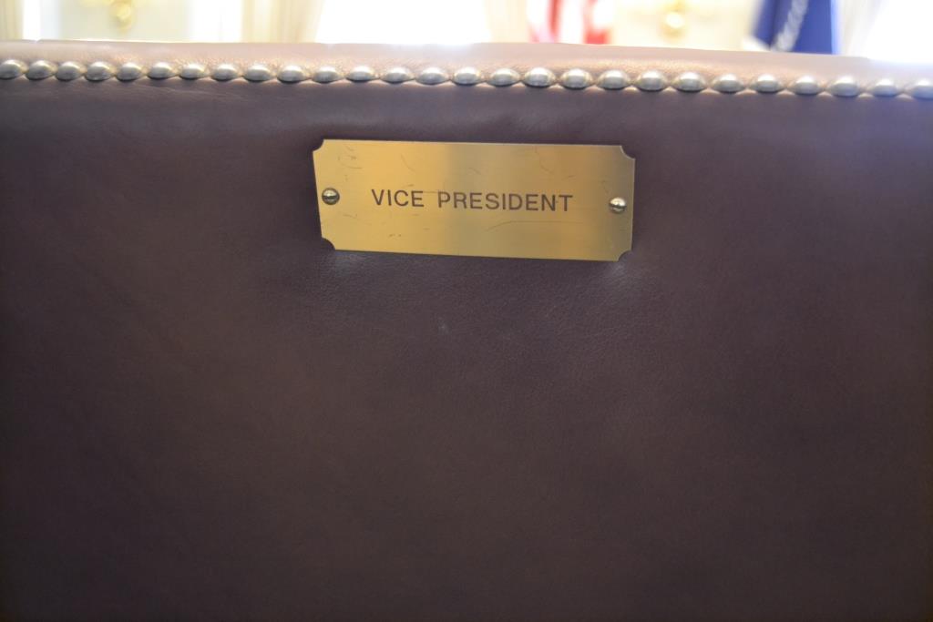 Bevor uns andere Touristen vor die Kamerabilder laufen. Wir folgen also der Beschilderung für das Oval Office, fahren mit dem Aufzug auf die dritte Etage und entdecken kurz darauf auch schon den Eingang. Zu meiner Freude trennt KEINE rote Samtschnur den Raum vom übrigen Besucherstrom ab. Das war mir besonders beim virtuellen Rundgang durch das Gebäude auf Google maps aufgefallen! Es war im Bereich des Möglichen, dass das Oval Office selbst gar nicht zugänglich ist und nur von außen durch den Türrahmen begutachtet werden darf. Mein Plan war aber, wenigstens einmal den Schreibtisch des Präsidenten zu berühren, wenn man schon nicht auf dem Ledersessel sitzen darf.