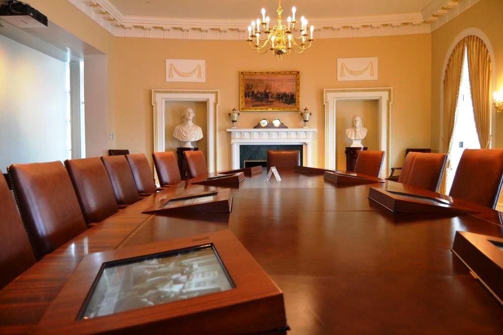 Wir spazieren hinein und kaum sind wir drin, sprechen uns auch sofort zwei Herren an, die im Rücken zur Tür standen und quasi nur auf Touristen gewartet haben! Unsichtbar für unseren Blick, denn logischerweise ist unser Blick nur auf den Arbeitsplatz des Präsidenten gerichtet!