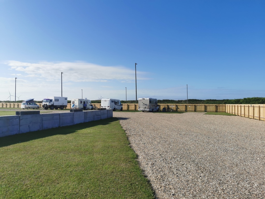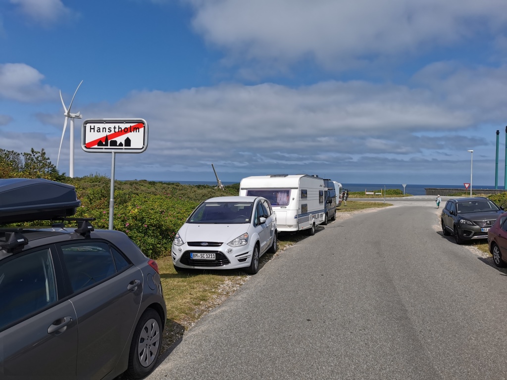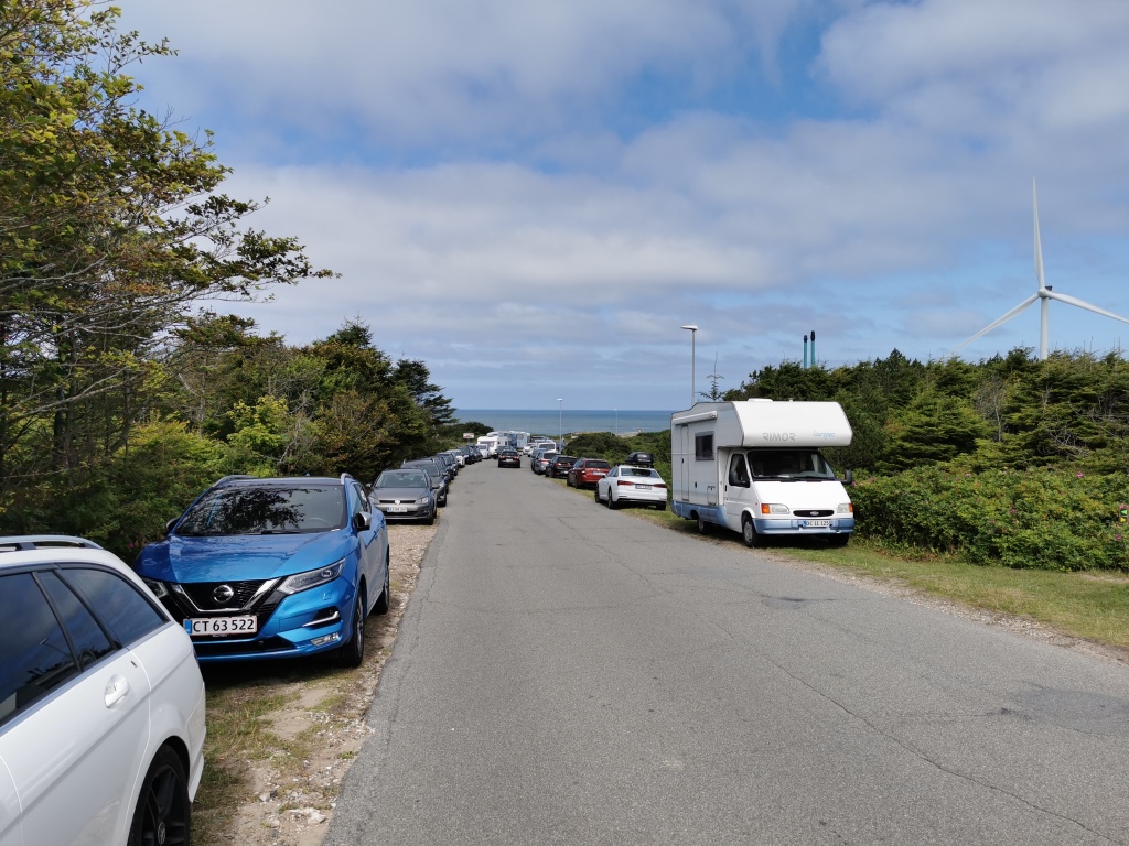 Zum Glück steht schräg rechts vor uns gleich das Ortsschild von Hanstholm. Zu diesem halte ich etwa eine halbe Wagenlänge Abstand. Groß genug, dass wir nachher, wenn wir wieder fahren, genügend Platz zum Rangieren haben. Aber eben auch klein genug, dass sich in die verbleibende Lücke zwischen uns und Ortsschild keiner mehr reinquetschen kann. Wie wichtig dies ist, zeigt sich gleich wenige Minuten später, als ein Kastenwagencamper aus Vechta hinter uns einparkt und dabei derart dicht auffährt dass er uns durch seine offene Seitenscheibe mit einem langen Arm das Fenster unserer Hecksitzgruppe putzen könnte! Würde vor uns noch so ein „Spezi“ einparken, wir könnten nicht rangieren, um später aus der Lücke wieder auszuparken! Aber hier passt das Ortsschild von Hanstholm schon auf. Wird also wohl passen.