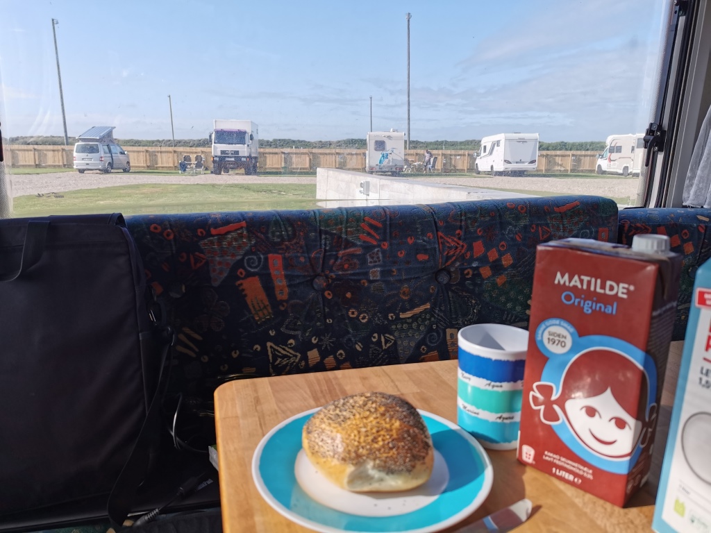 Gegen kurz nach 9 sind Nils und ich zurück beim Wohnwagen. Die Sonne scheint noch immer hell und warm vom fast wolkenlosen blauen Himmel und es wäre ein perfekter Tag, um draußen in der Sonne zu frühstücken. Zu blöd, dass heute der Abreisetag ist und wir schon gestern Tisch und Stühle im Auto verstaut haben. Diese jetzt nochmals heraus zu räumen ist leider in Anbetracht der drohenden Abfahrtszeit unmittelbar nach dem Frühstück keine Option. Aber auch in unserer tollen Wohnwagen- Lounge mit den Fenstern in gleich drei Richtungen können wir die Sonne beim Frühstück genießen. Nur putzen müssen wir die Fenster mal wieder! Die sind irgendwie recht dreckig geworden auf dieser Reise…